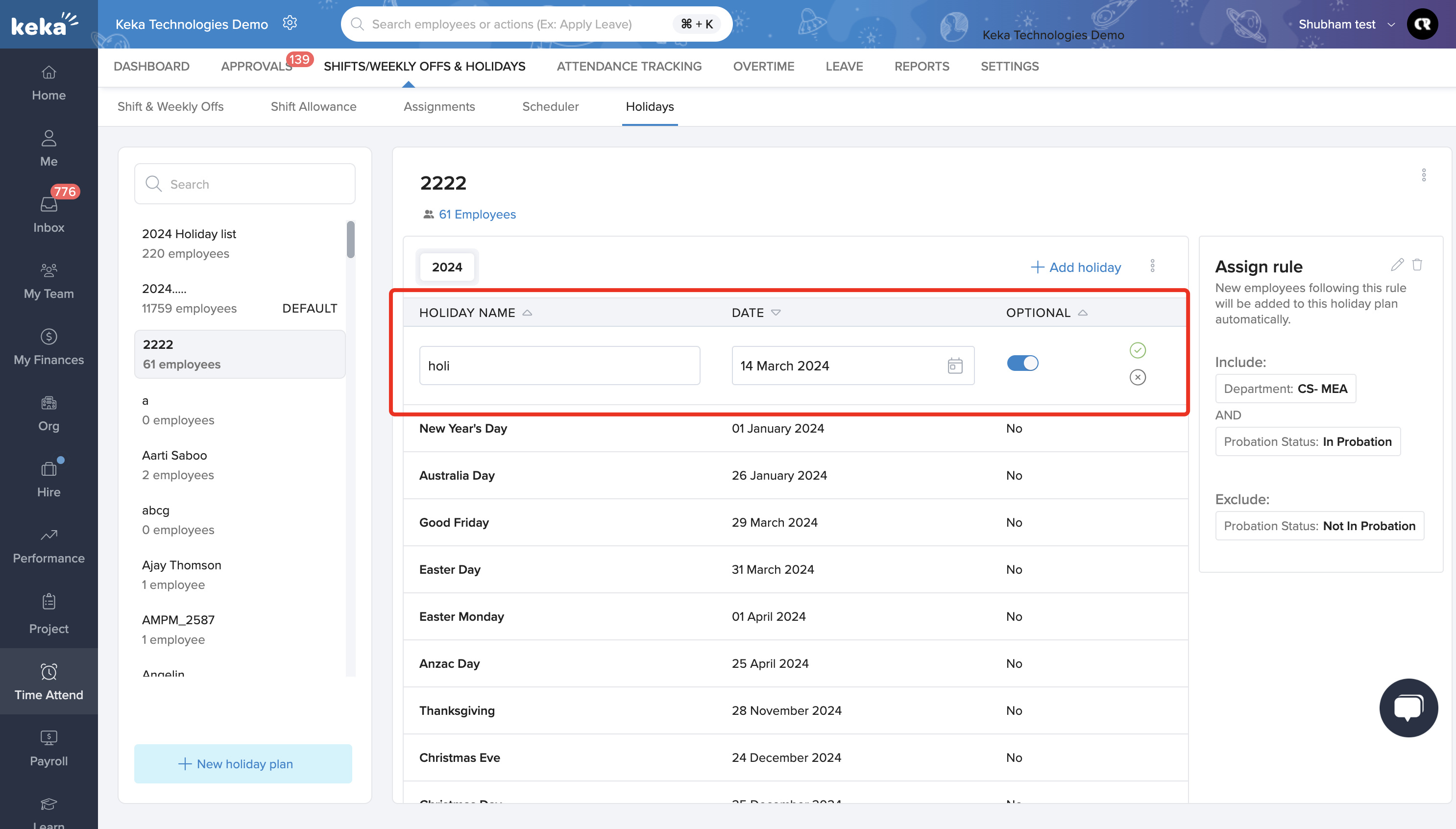 In the new field, provide the name of the holiday you wish to add and select the corresponding date and year from the calendar. Keka also offers the option to designate any holiday as Optional or Special; simply toggle the switch to make your selection. Once you have made your choices, click the green checkmark to save the holiday to your list.