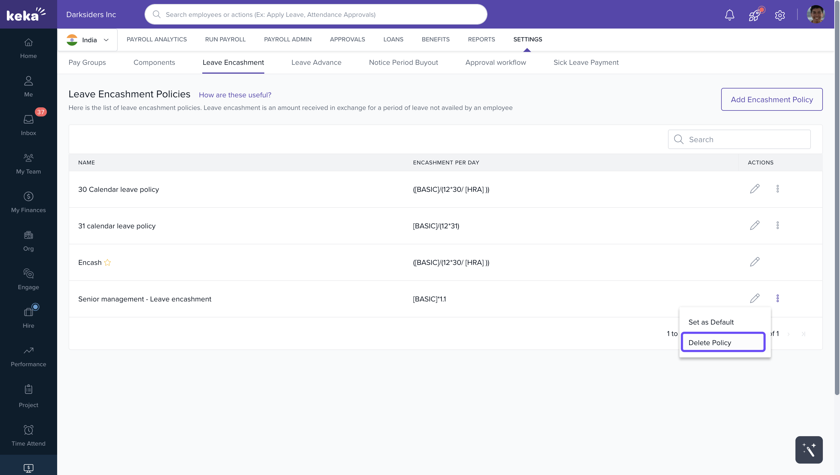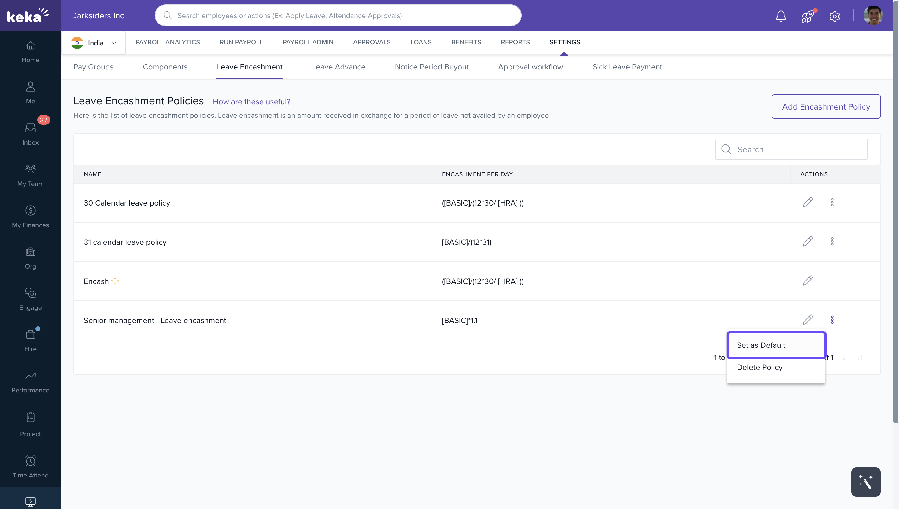 You can edit, delete, or set a policy as the default from the Leave Encashment Policies page.
