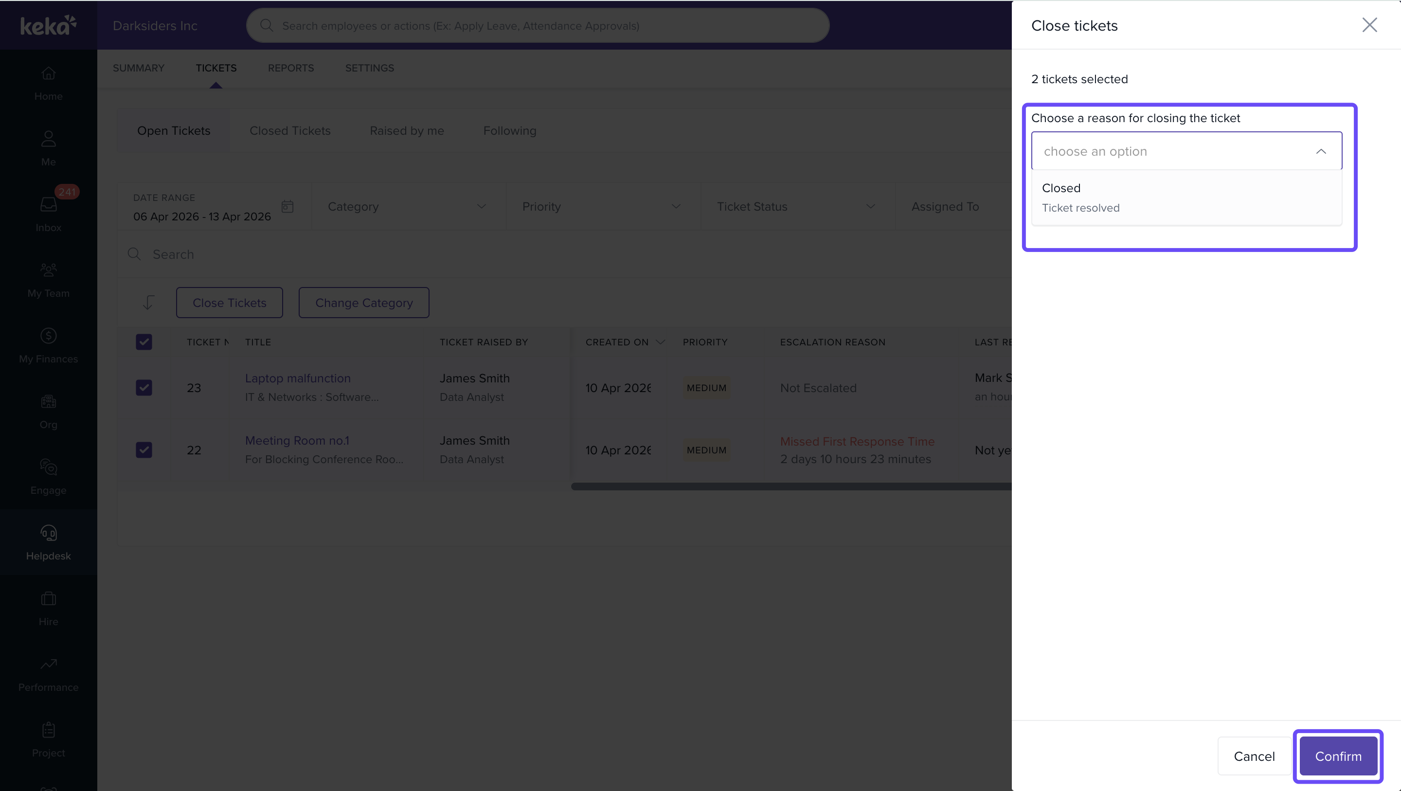 - Then on the overlay window, Choose a reason for closing the ticket & click on Confirm.