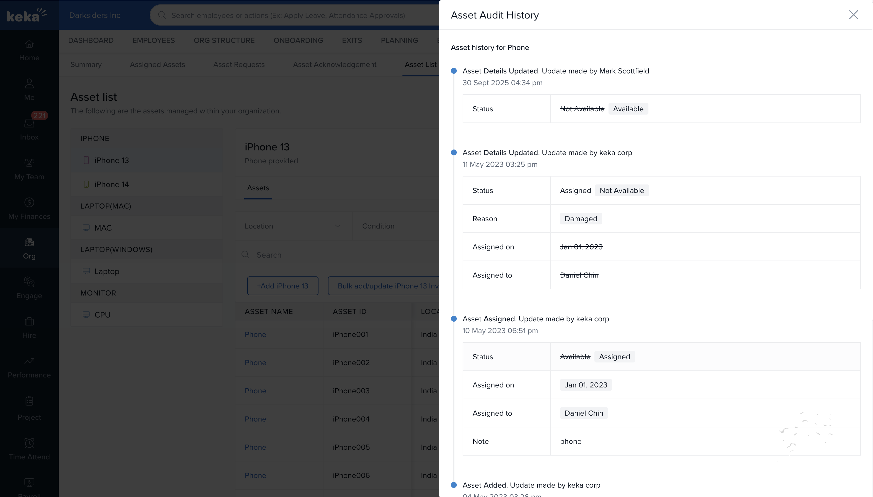 Organizations provide assets like laptops, headphones, and software to employees to aid their work. If you need to track an asset's history, including changes made to it, Keka allows you to easily view the audit history.