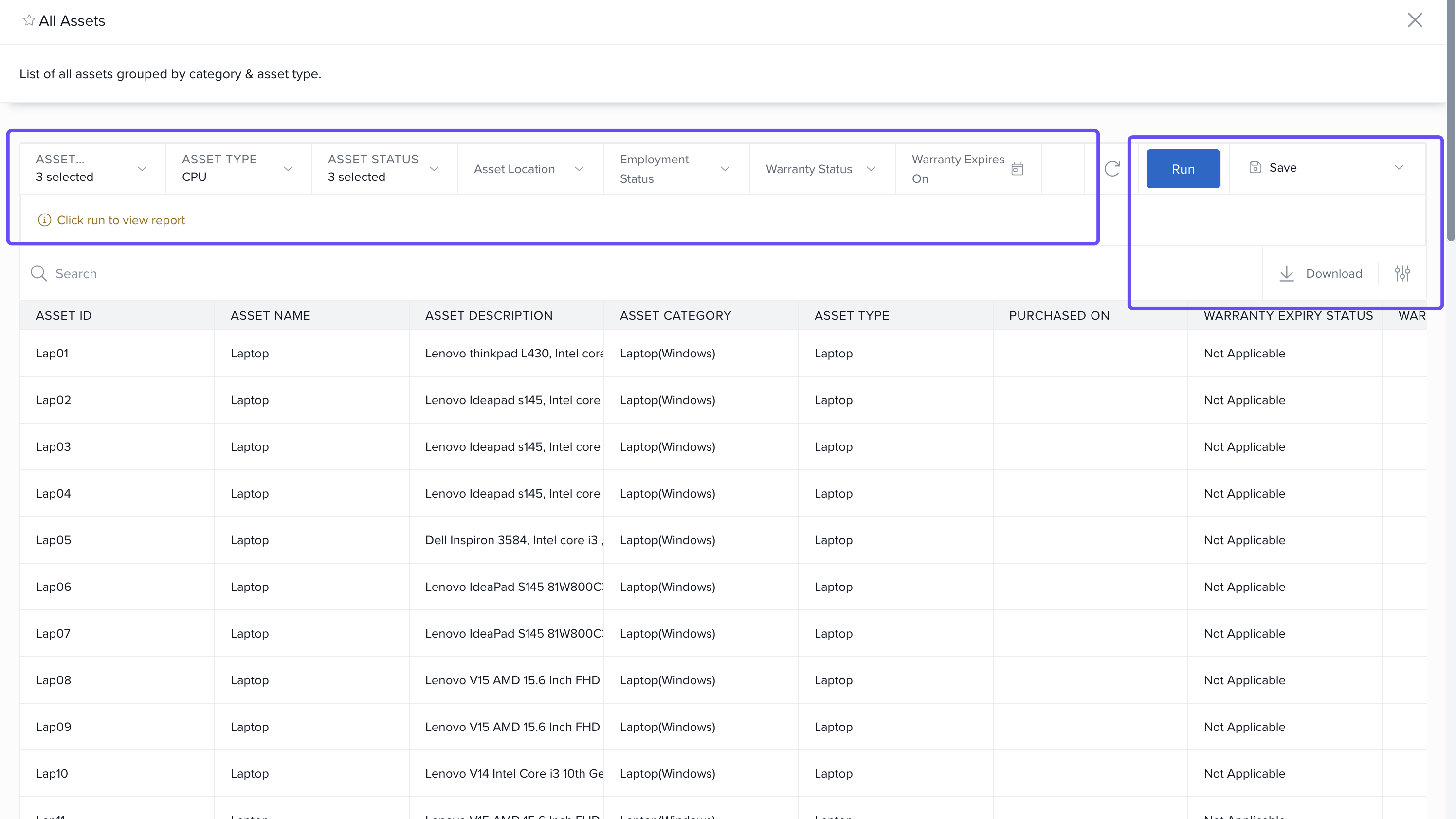 Use the filters such as Asset Category, Asset Type, Asset Status, Asset Location, Warranty Status, and Warranty Expiry to refine the report.