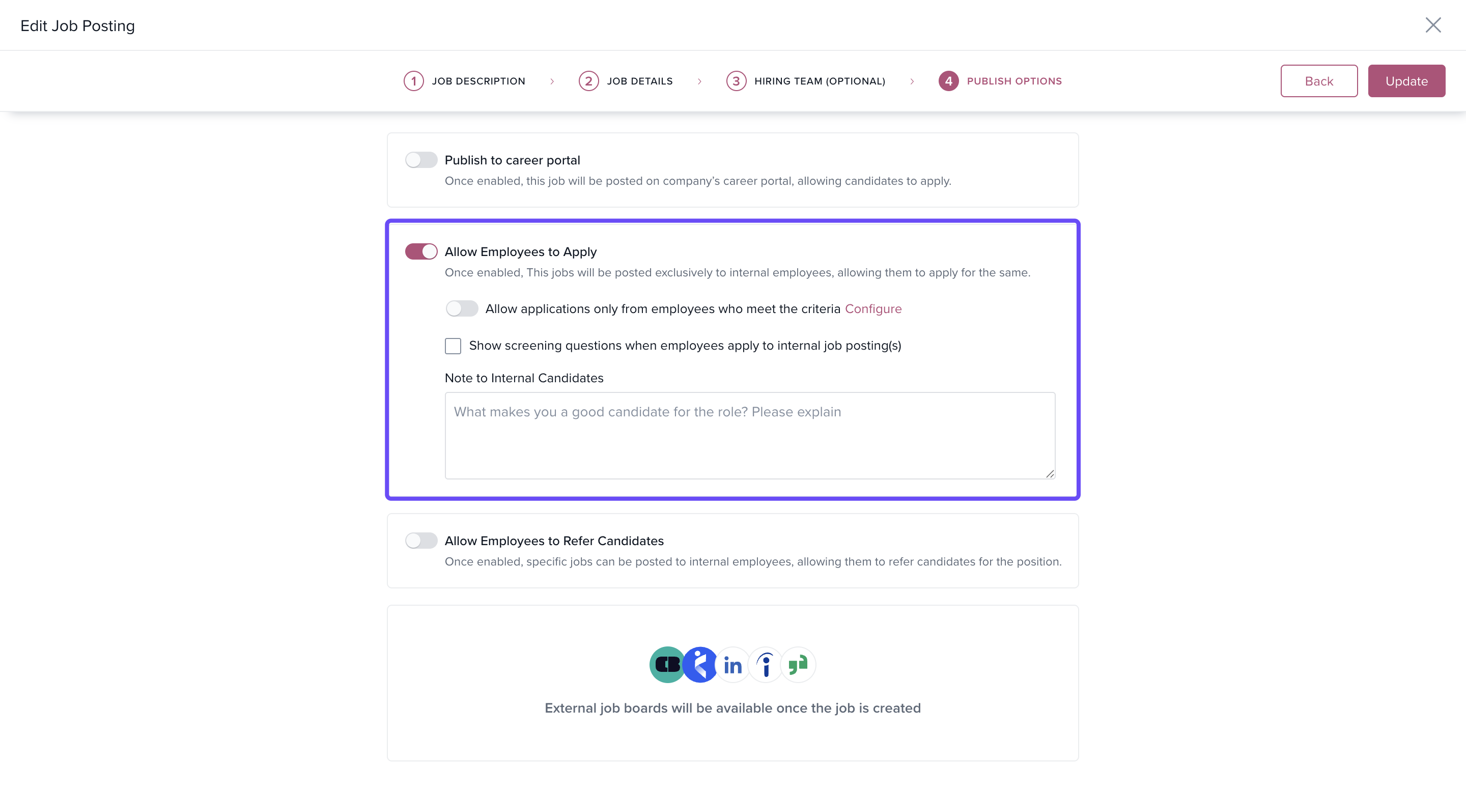 - Then, select Publish on Internal Job Portal & Allow Employees to Apply