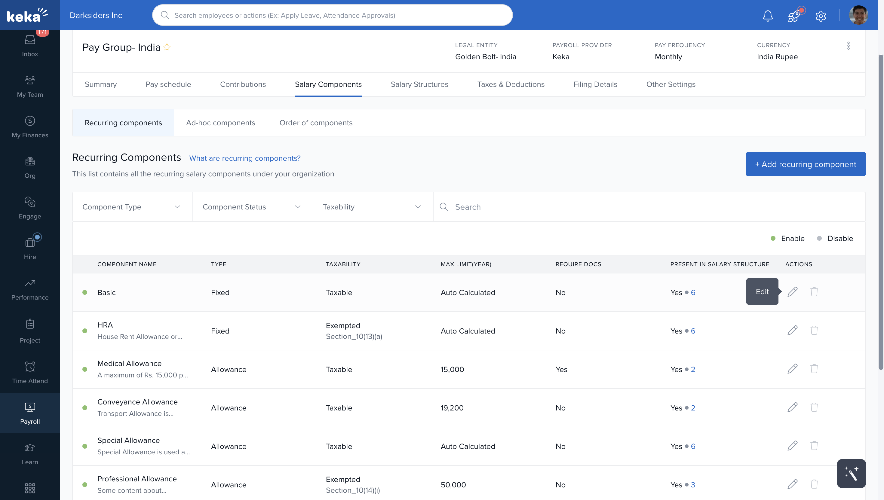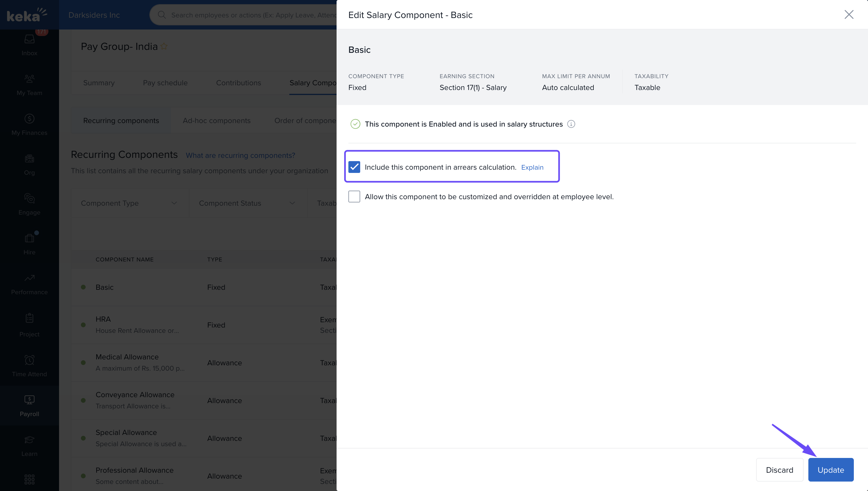 You can easily enable or disable arrears calculation for specific salary components in Keka.