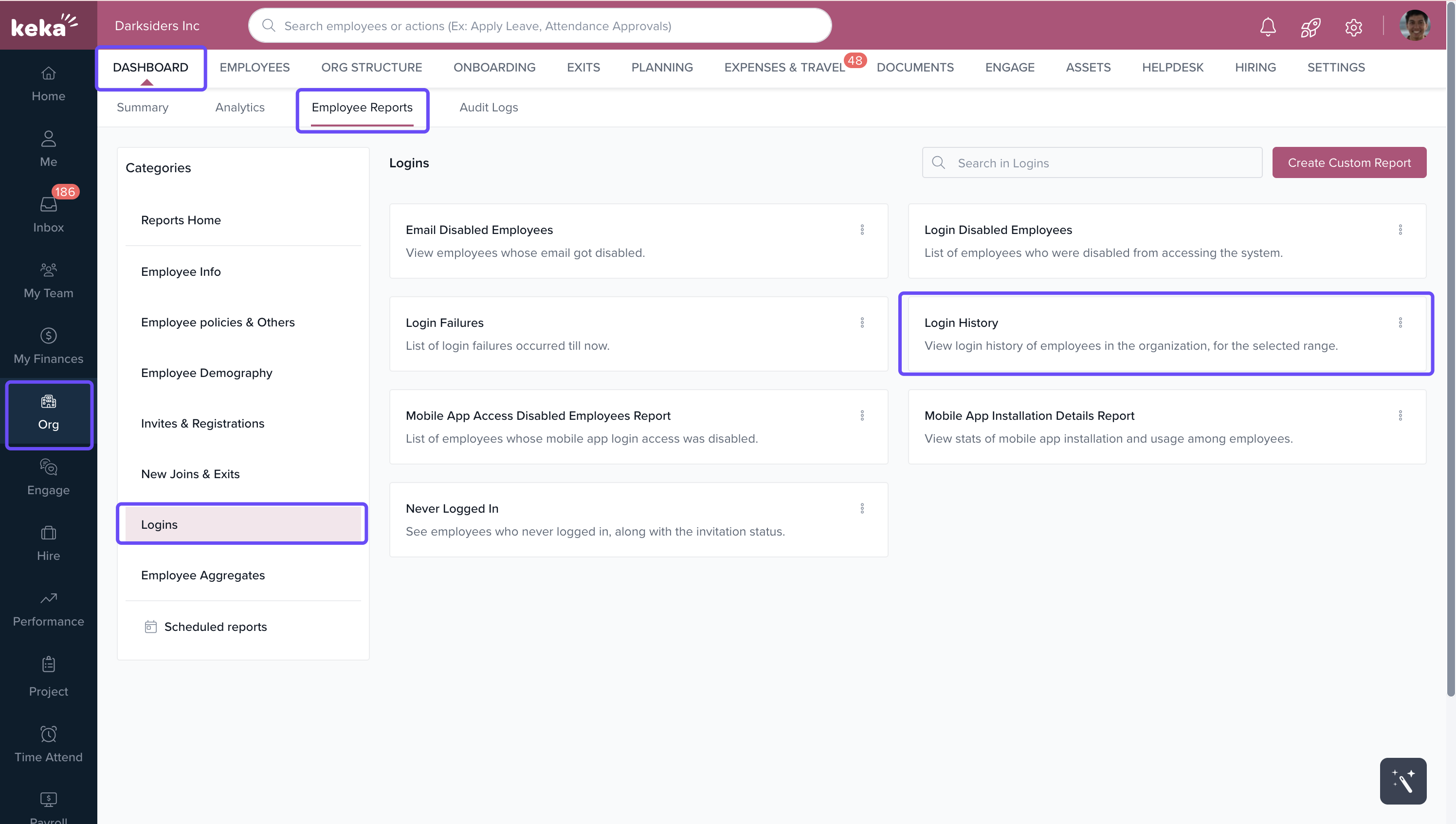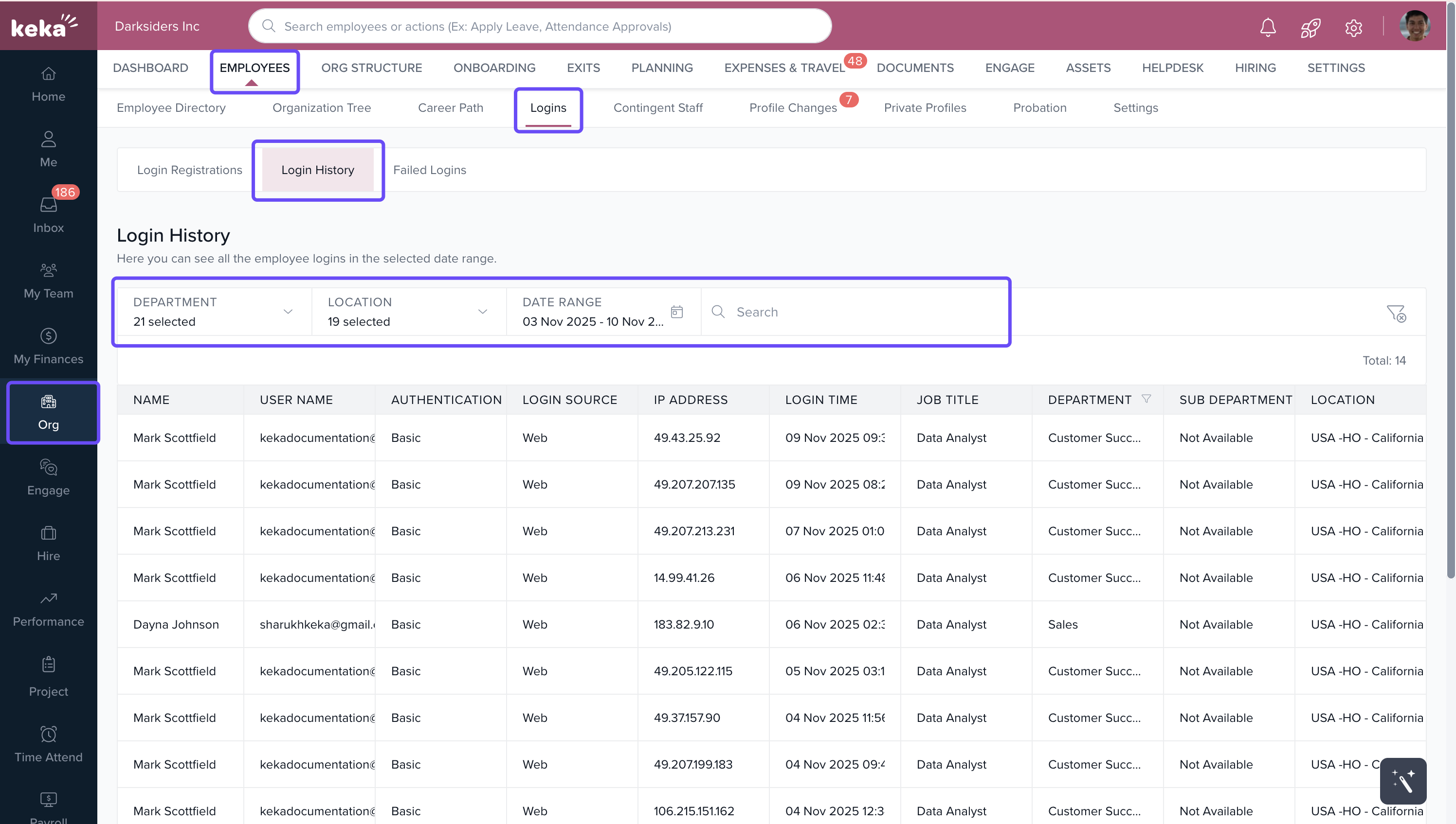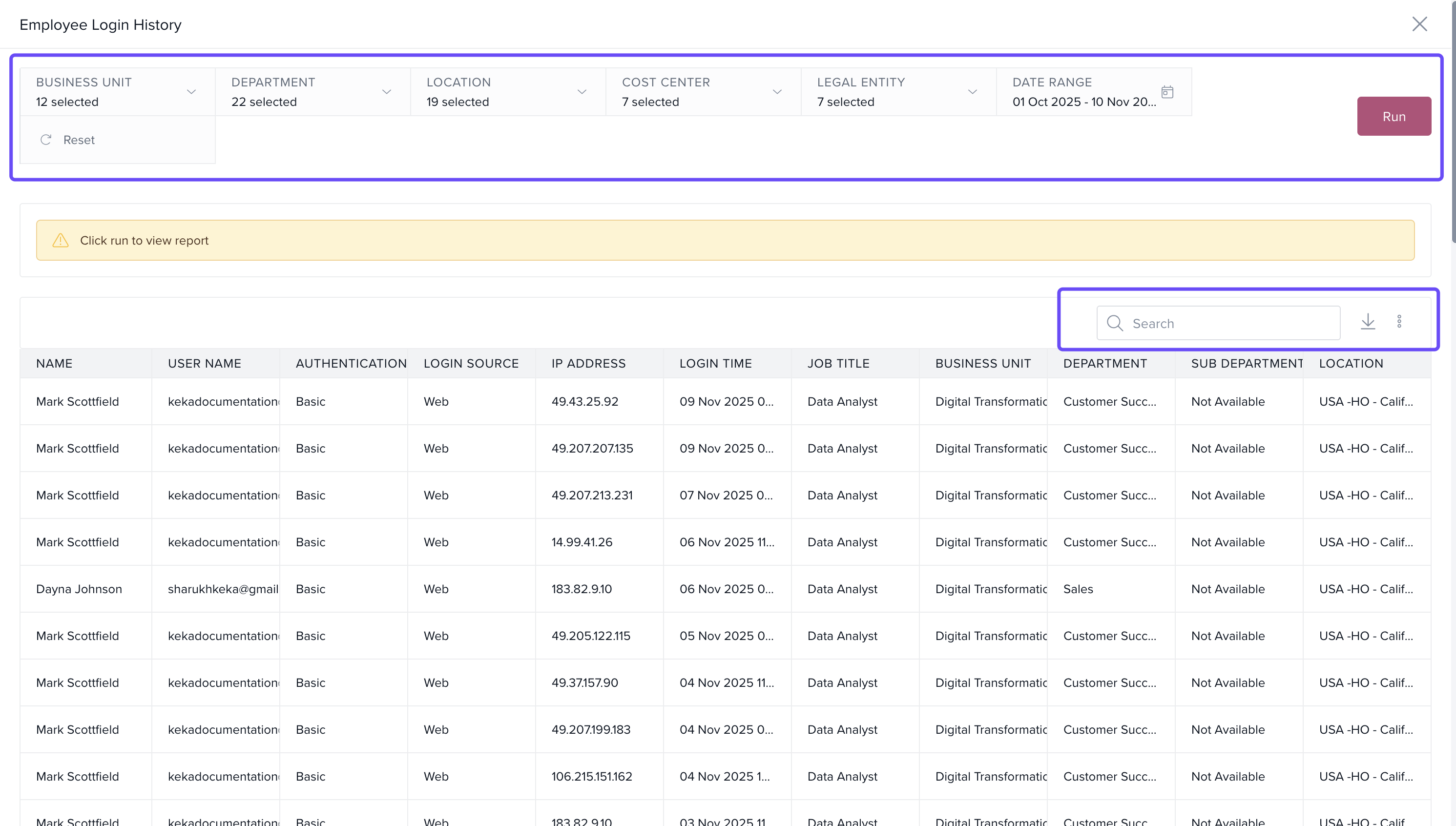 Keka records all employee login details, including the login source, IP address, and login time. You can view this information for a specific time range or download a detailed report for analysis or record-keeping.
