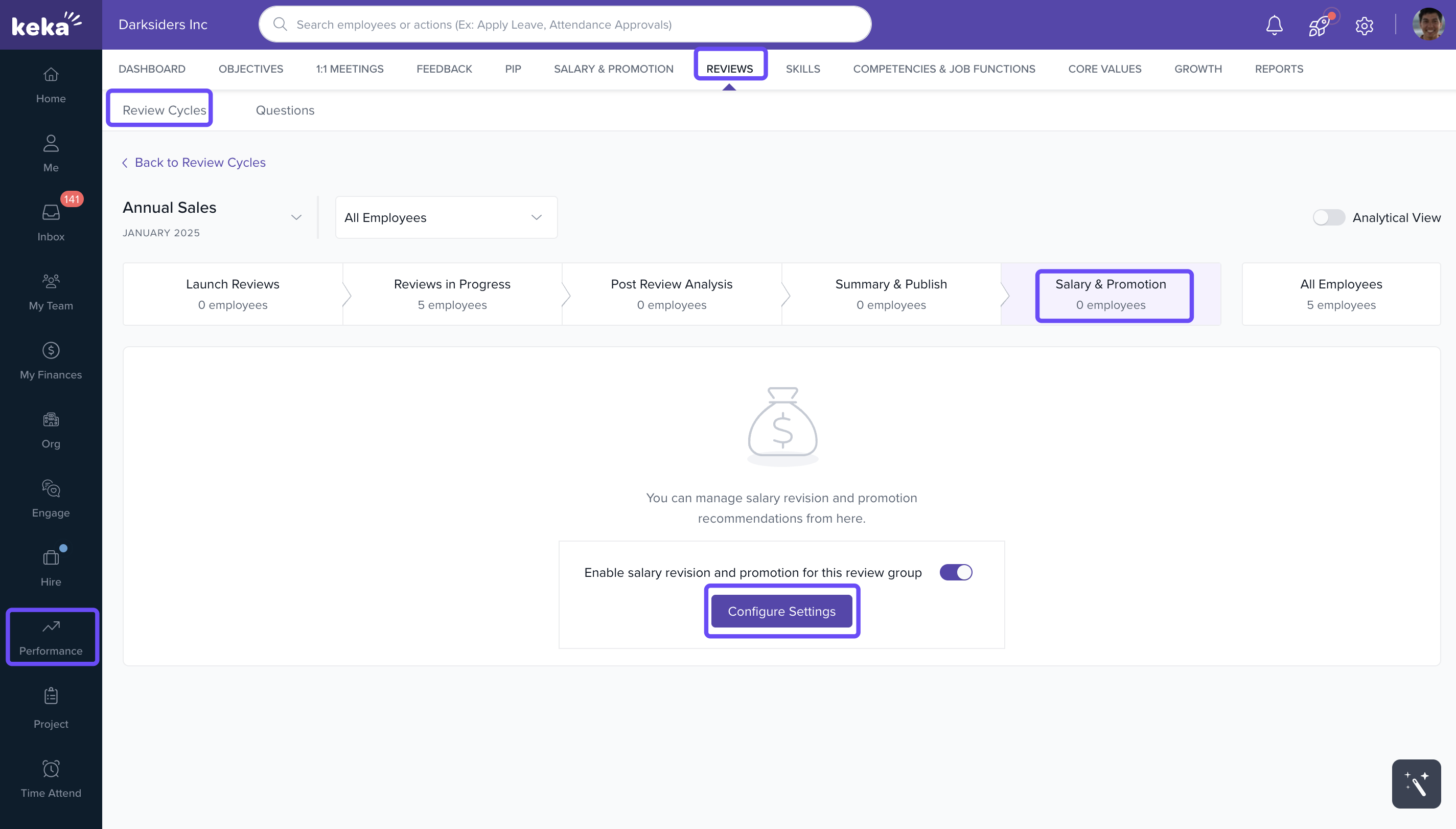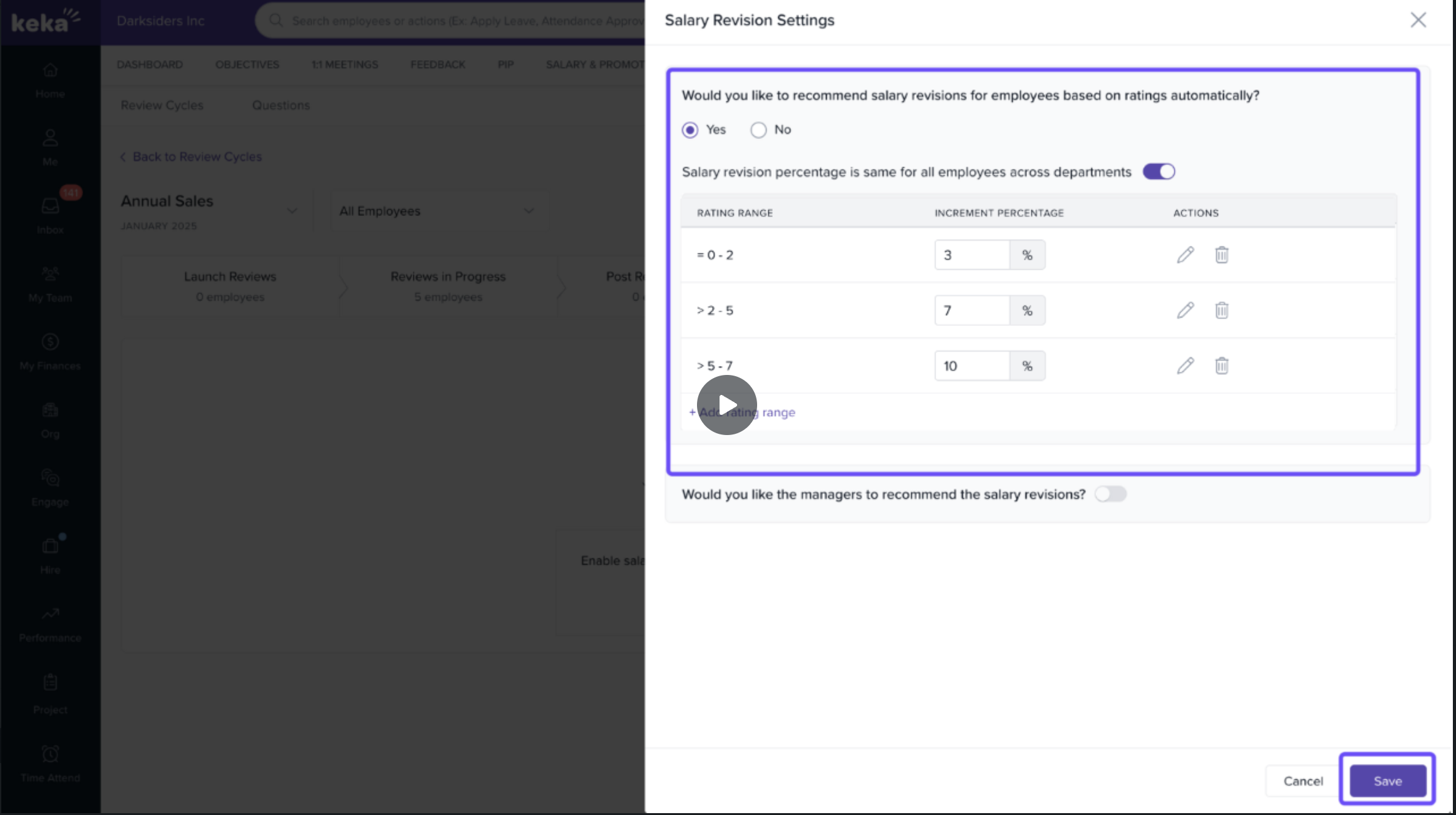 Only Global Admins and Performance Admins can configure automatic salary increment percentage ranges in Keka.