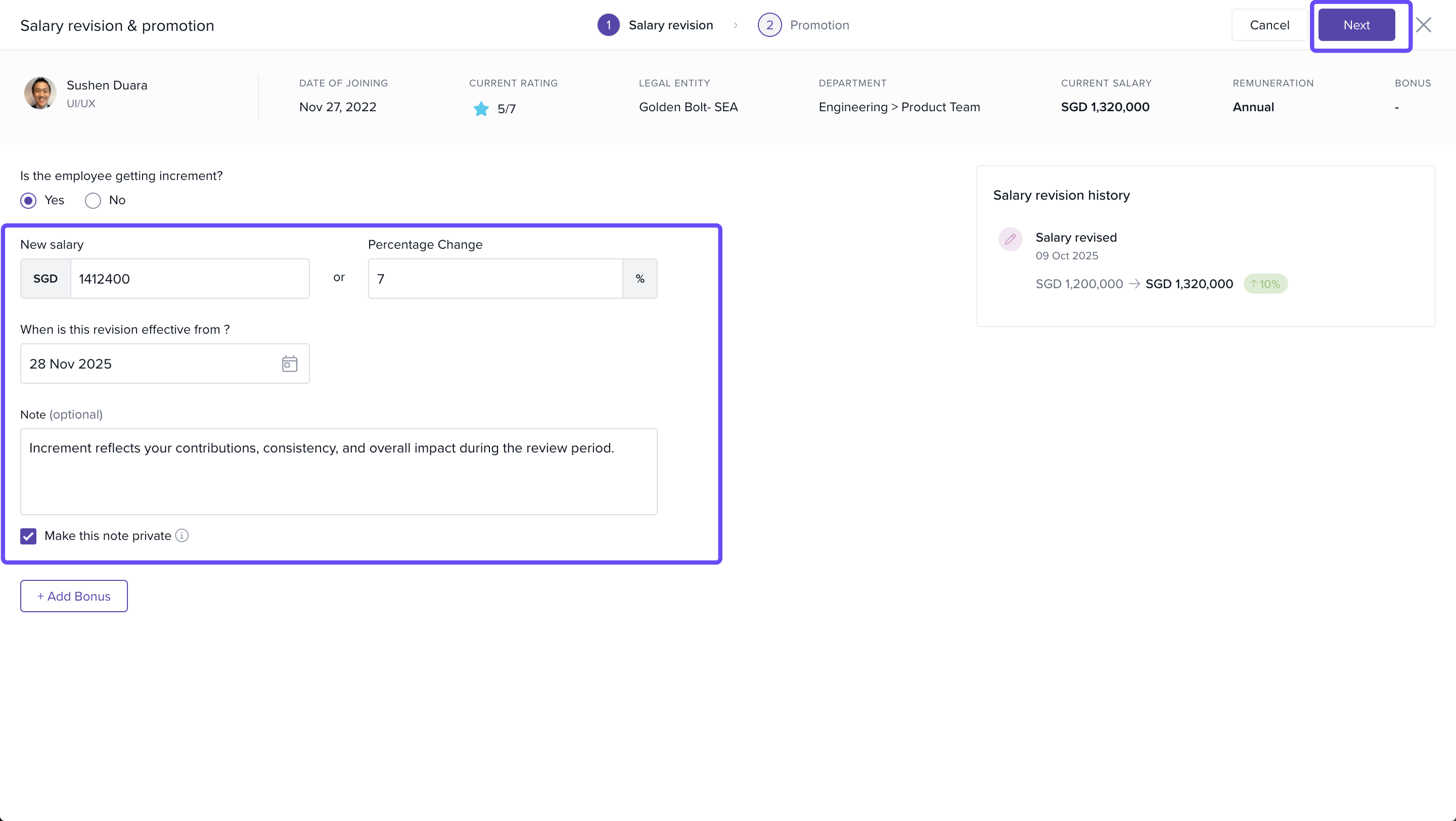 Admins can enter a custom percentage and provide a reason for the change to ensure clarity and maintain proper documentation. Once done, click on Next.