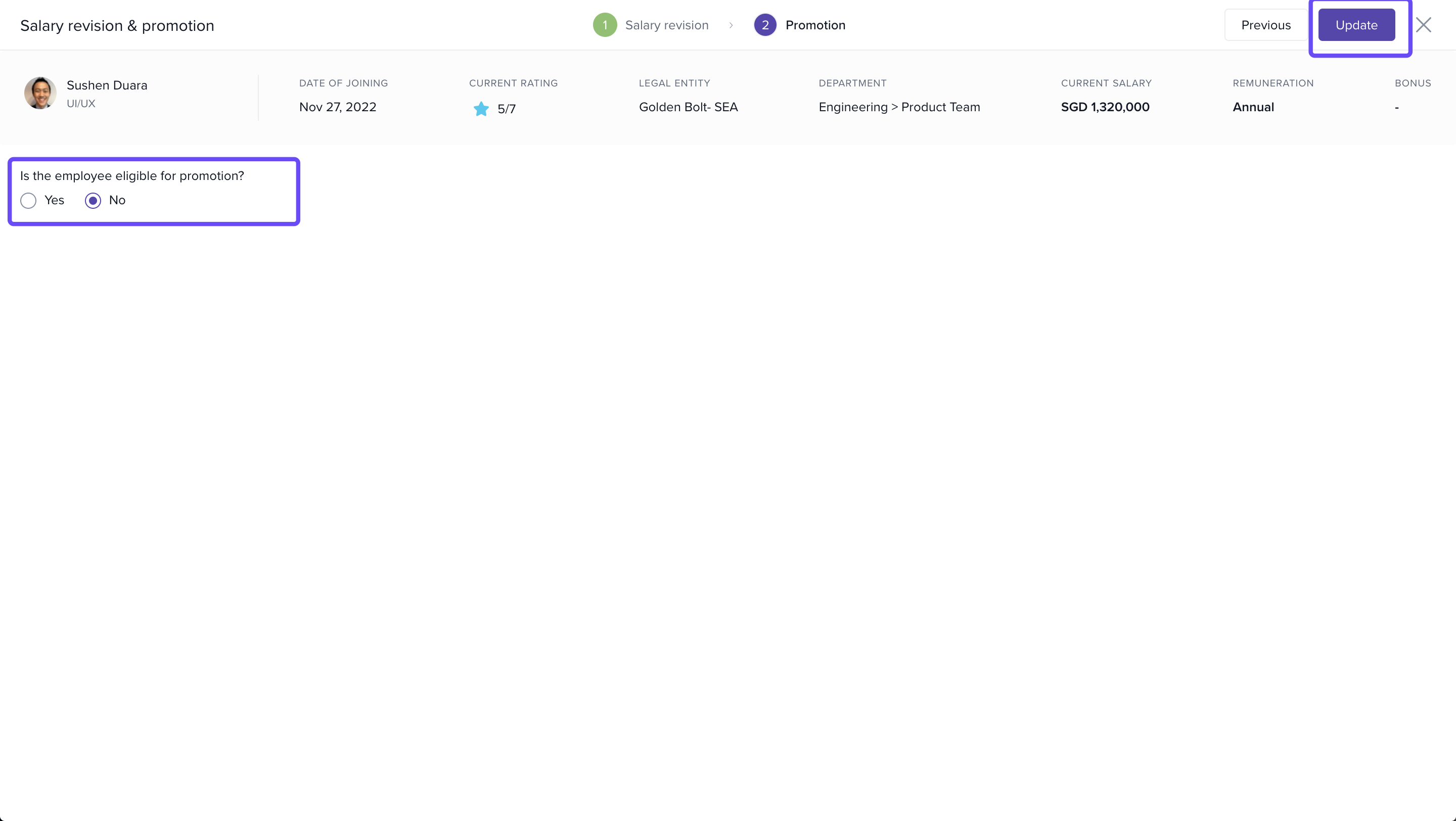 Choose whether to promote the employee by selecting Yes or No, and then click Update to save your decision.
