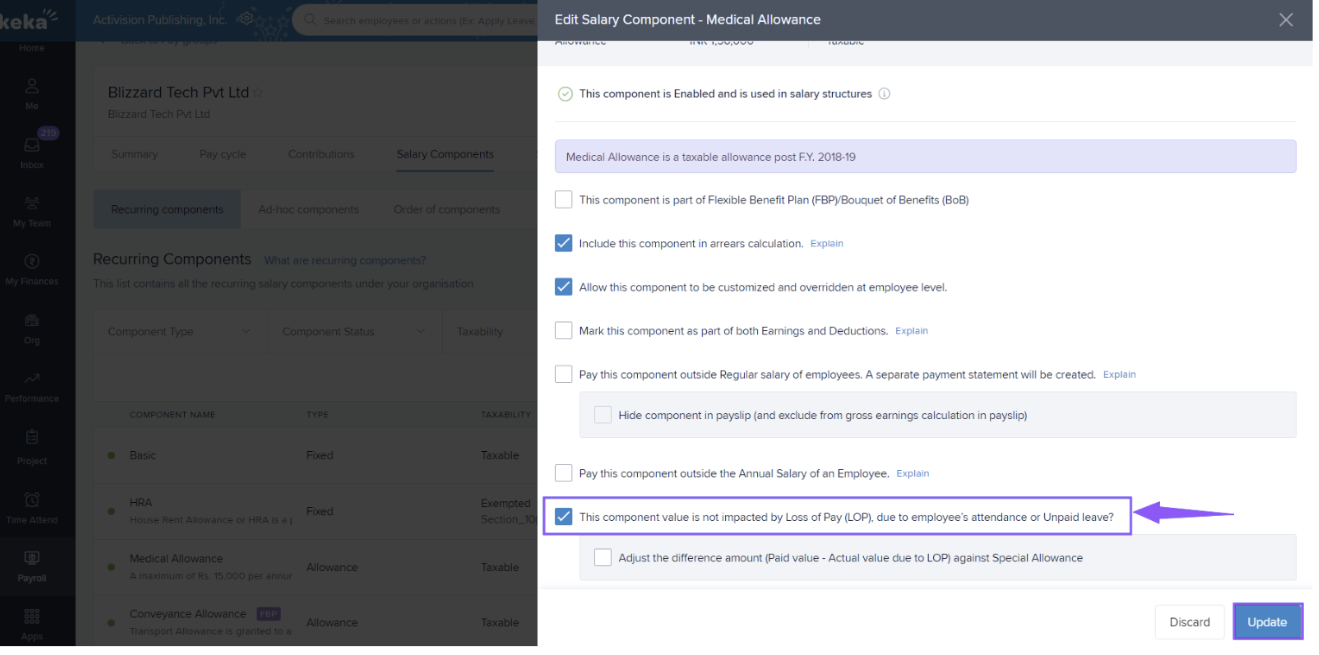 In Keka, payroll components can be adjusted based on employee attendance or leave without pay (LOP).
