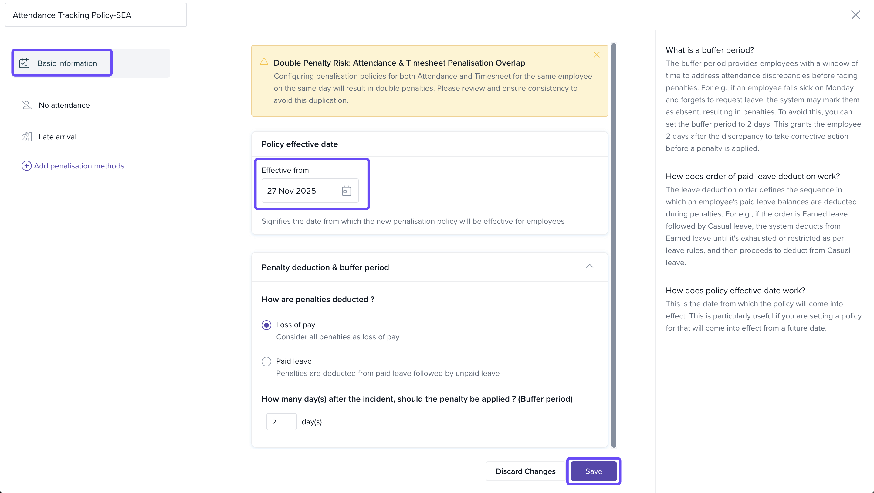 - In the Basic Information section, set the effective date for the new version of the penalisation policy and click Save.