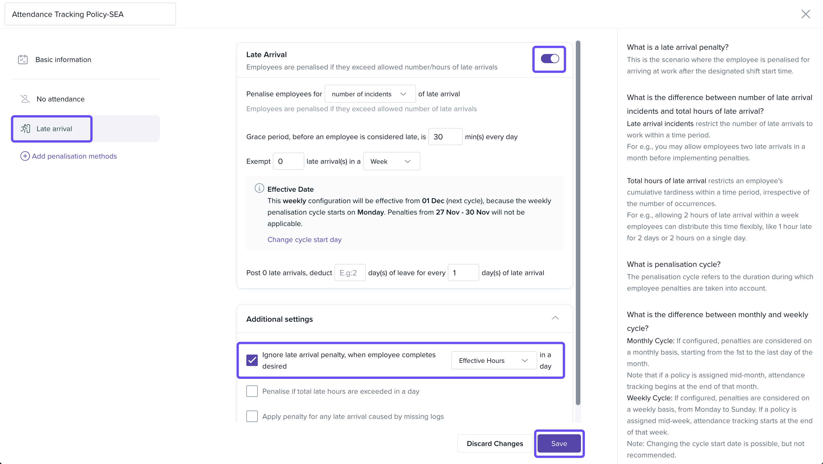 - Under Additional Settings, check the option "Ignore late arrival penalty, when employee completes desired Effective Hours/Gross hours in a day."