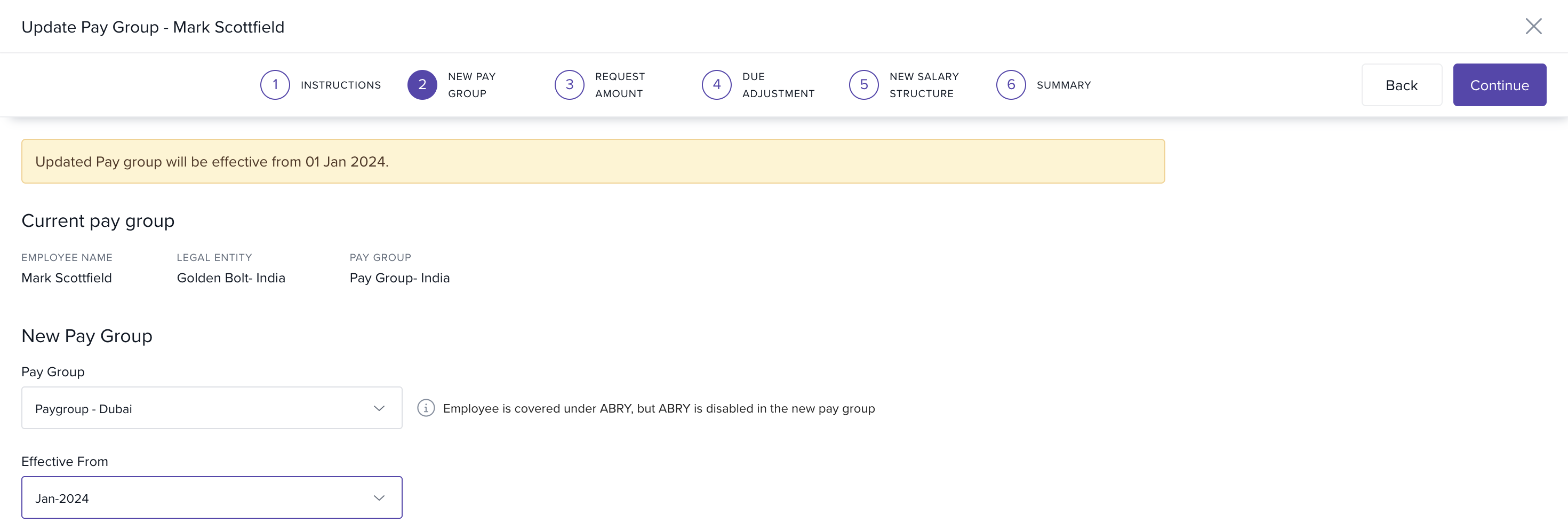 In the New Pay Group tab, select the new pay group and the effective month for the change. Click Continue.