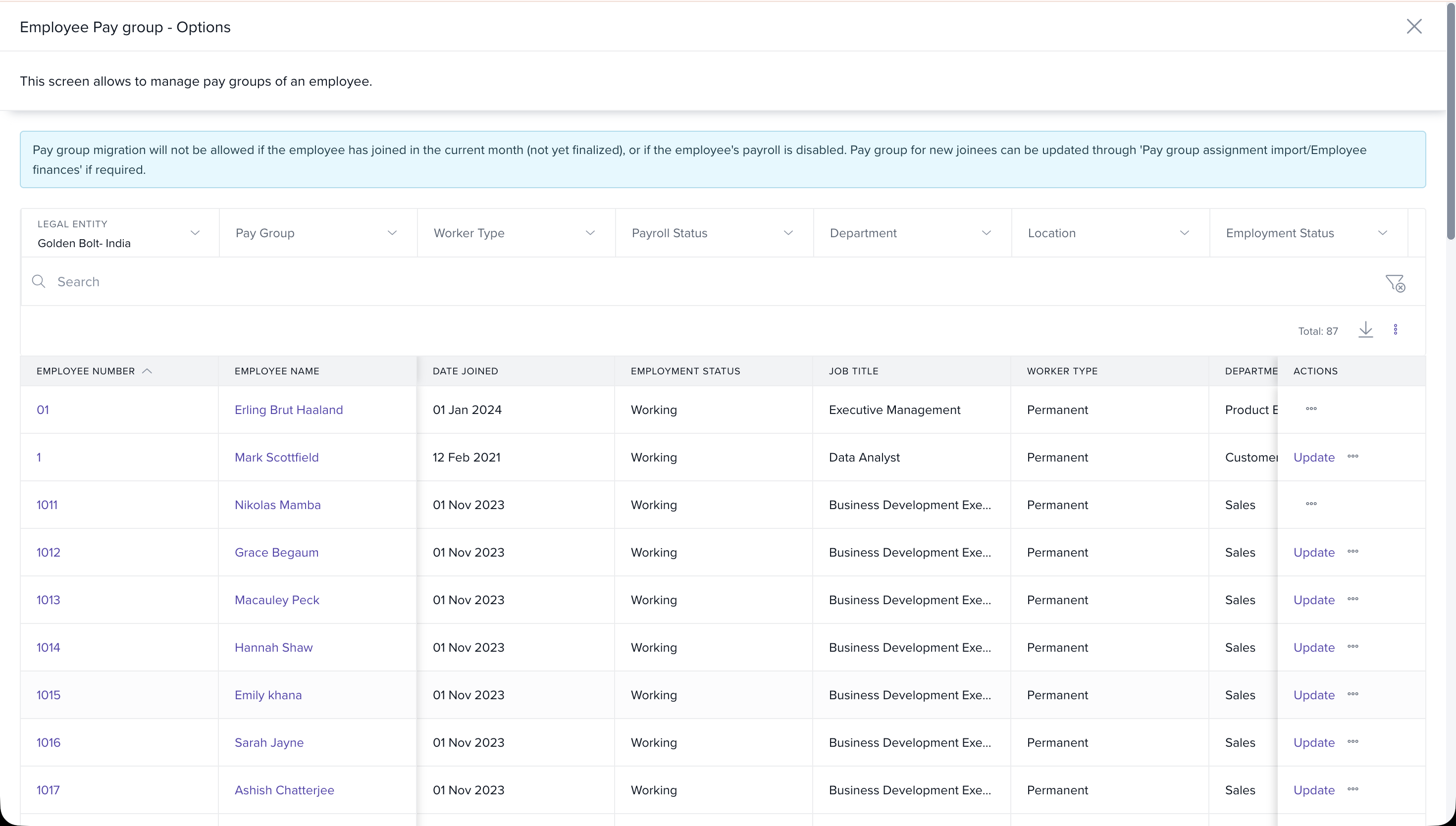 Choose the Pay Group the employee currently belongs to. Find the employee in the table and click Update.