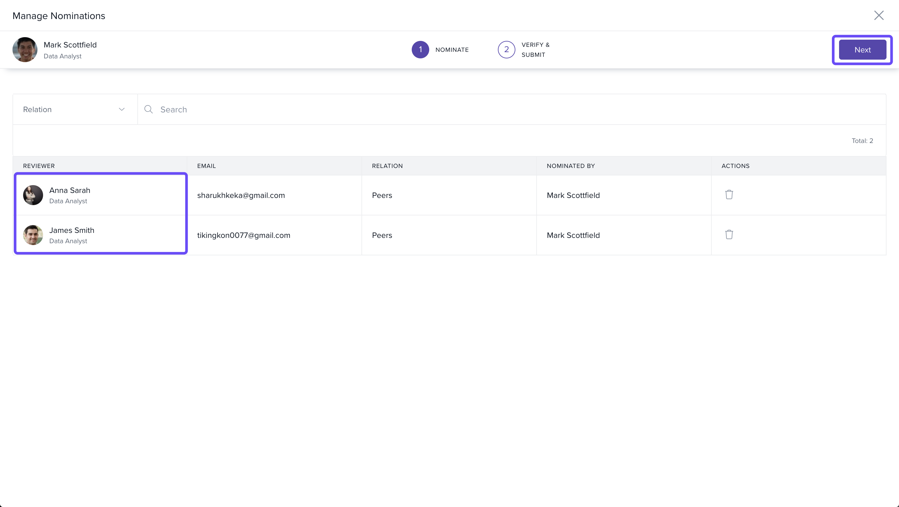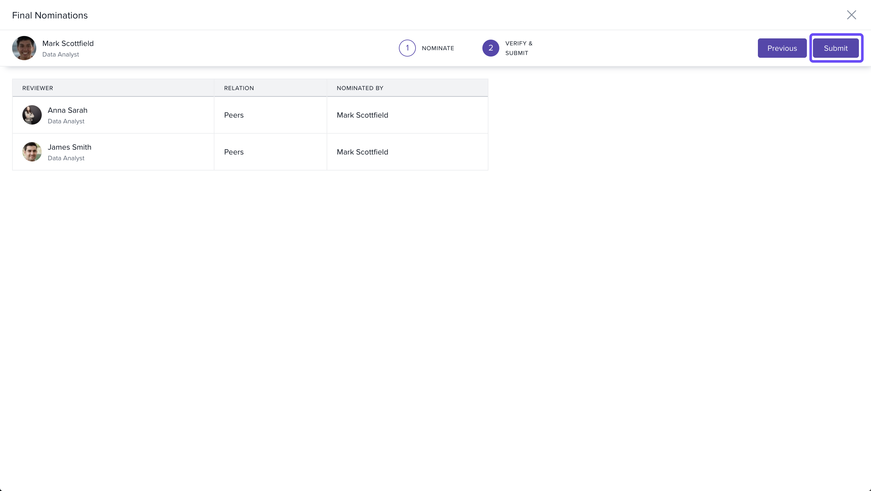 14. Review the list of nominated reviewers, their relation, and the nominator’s name.