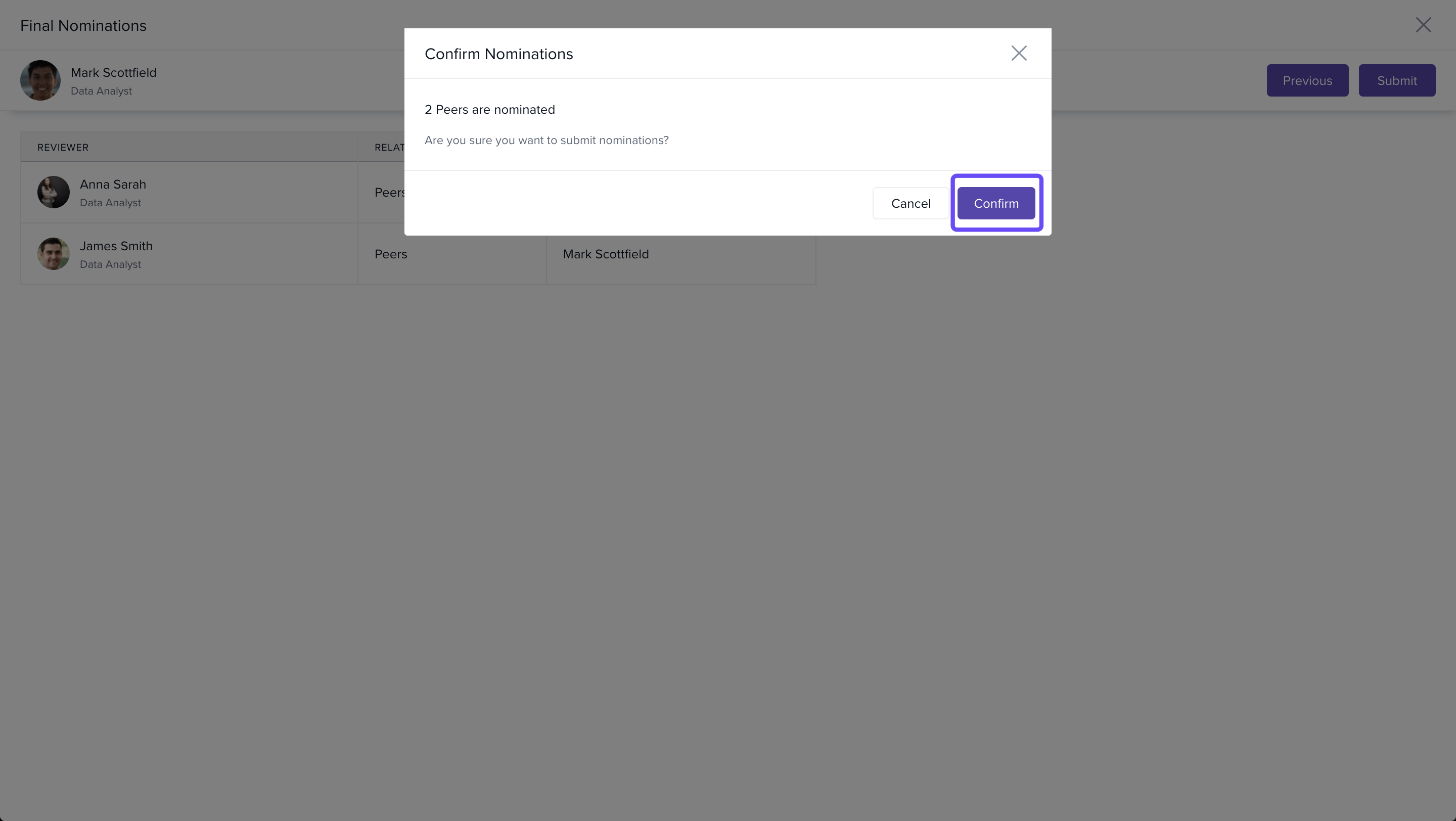 16. A confirmation pop-up will appear — click on Confirm to finalise the nominations.