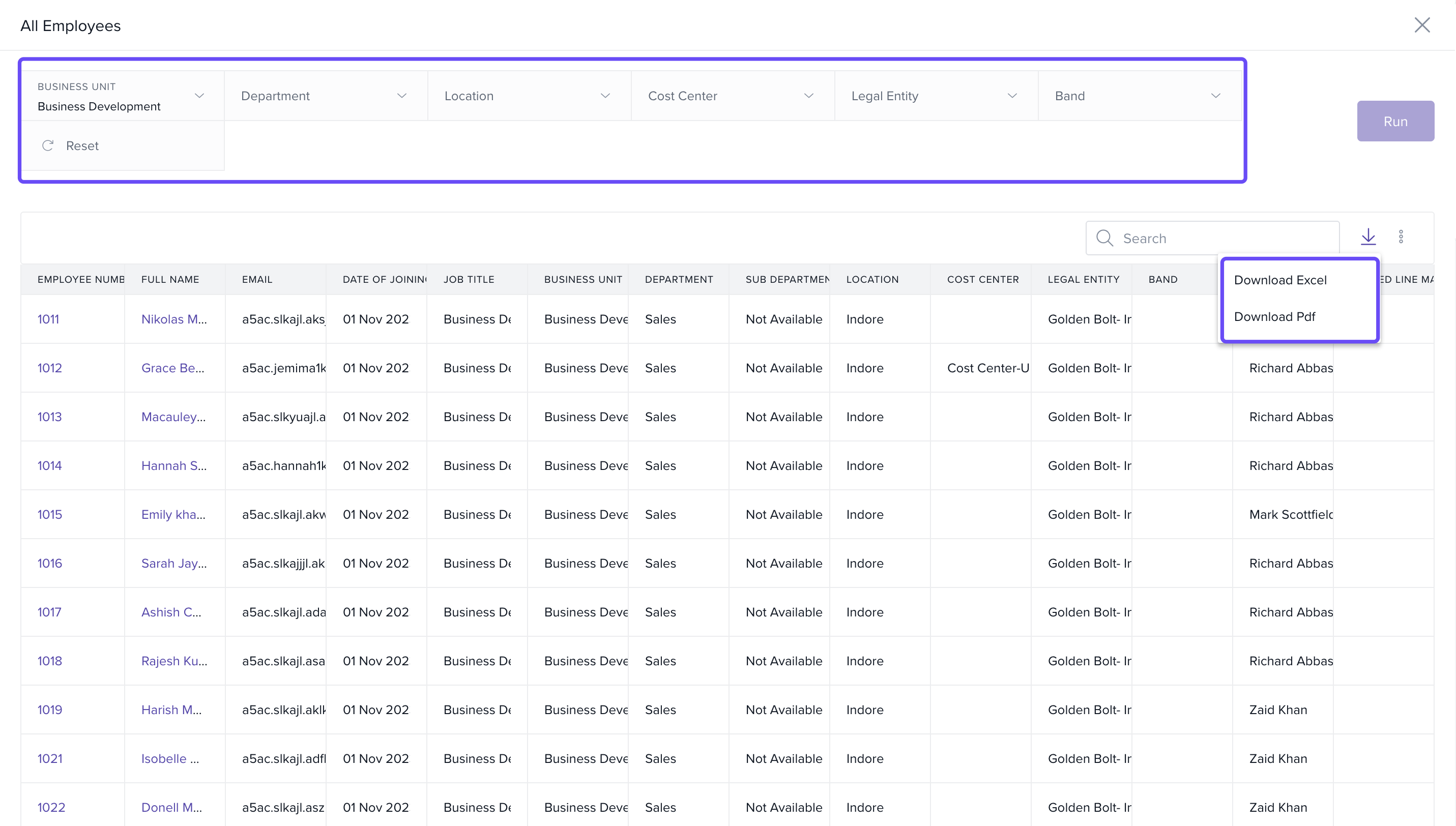 - Apply the necessary filters such as Business Unit, Department, Location, Cost Center, and Band.