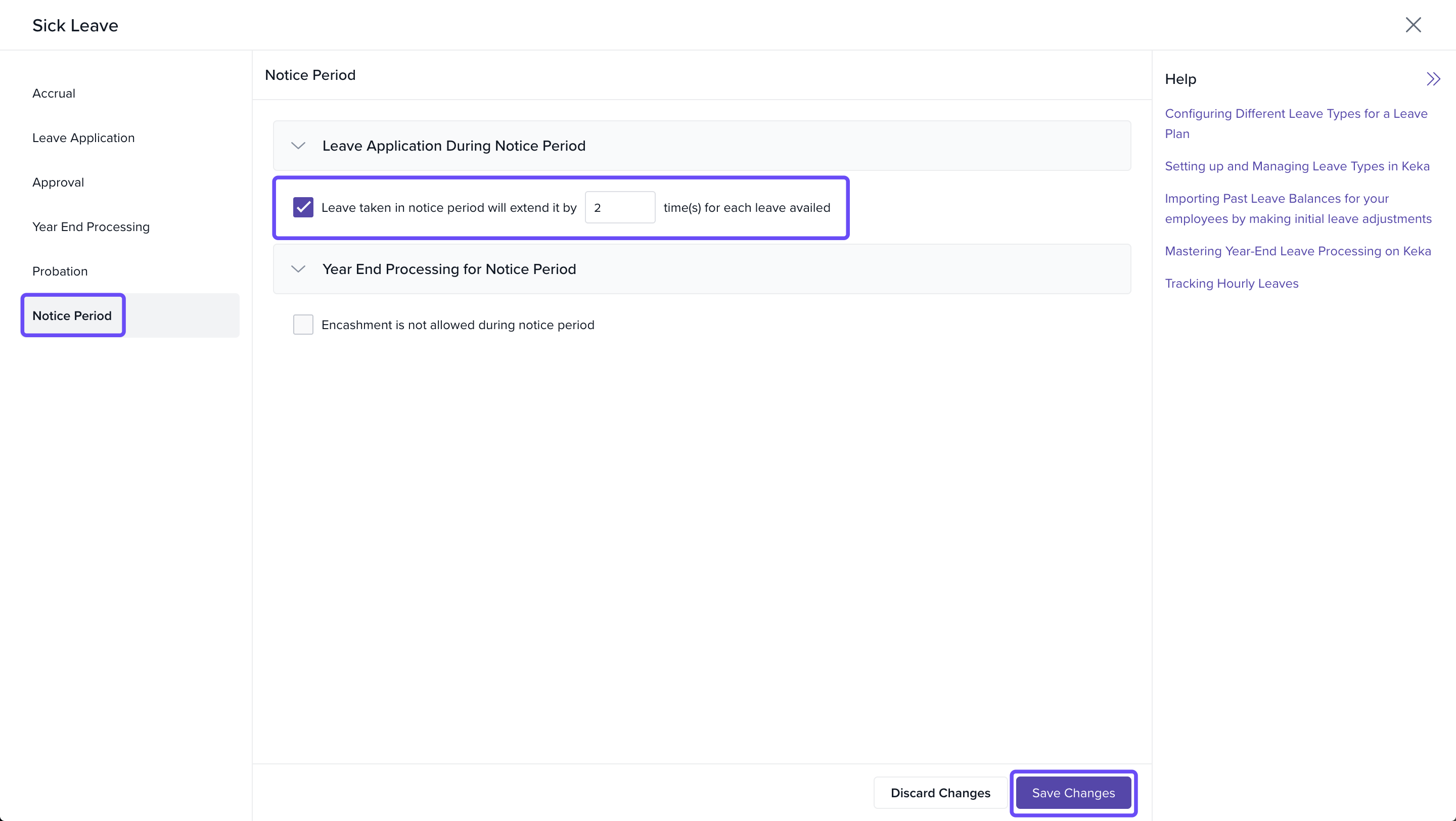 - Uncheck the option "Leave taken in notice period will extend by ___ times for each leave availed."