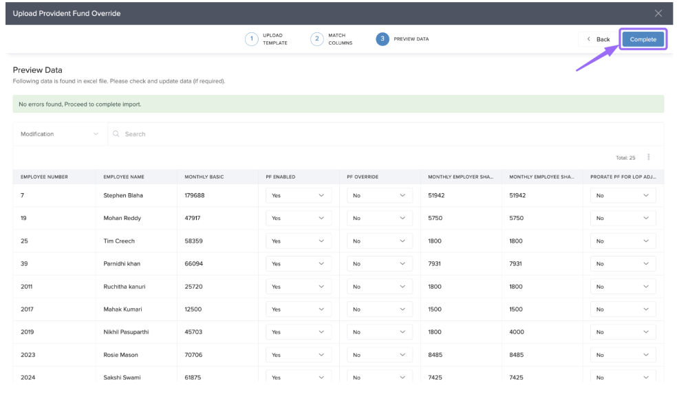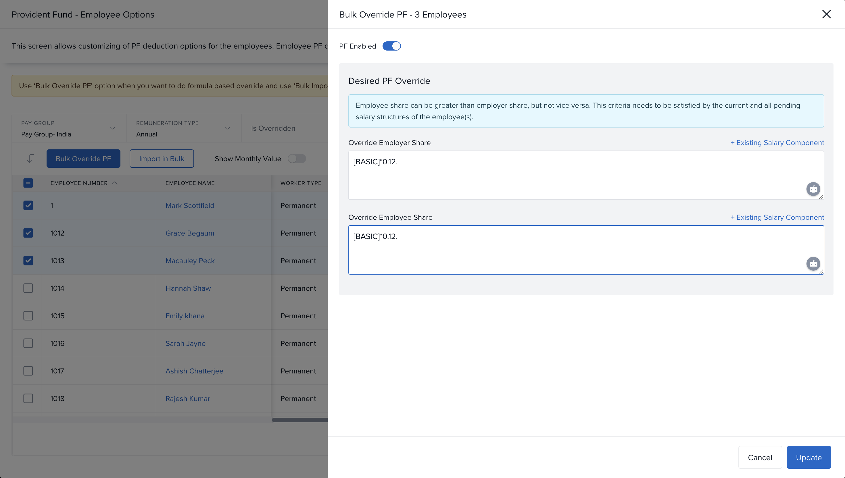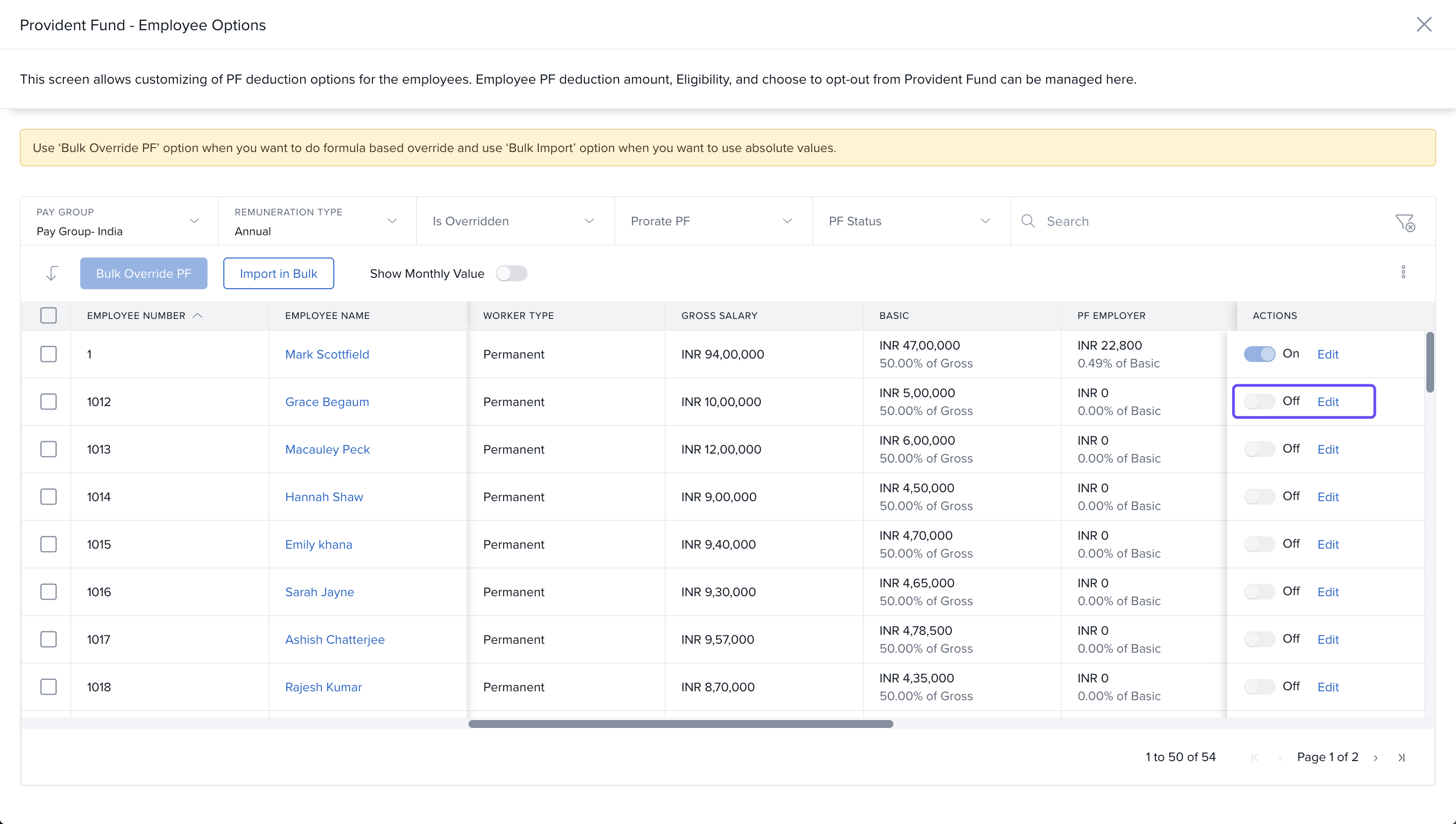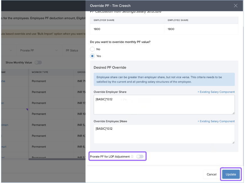 Keka allows you to override PF contribution amounts for individual employees or in bulk.
