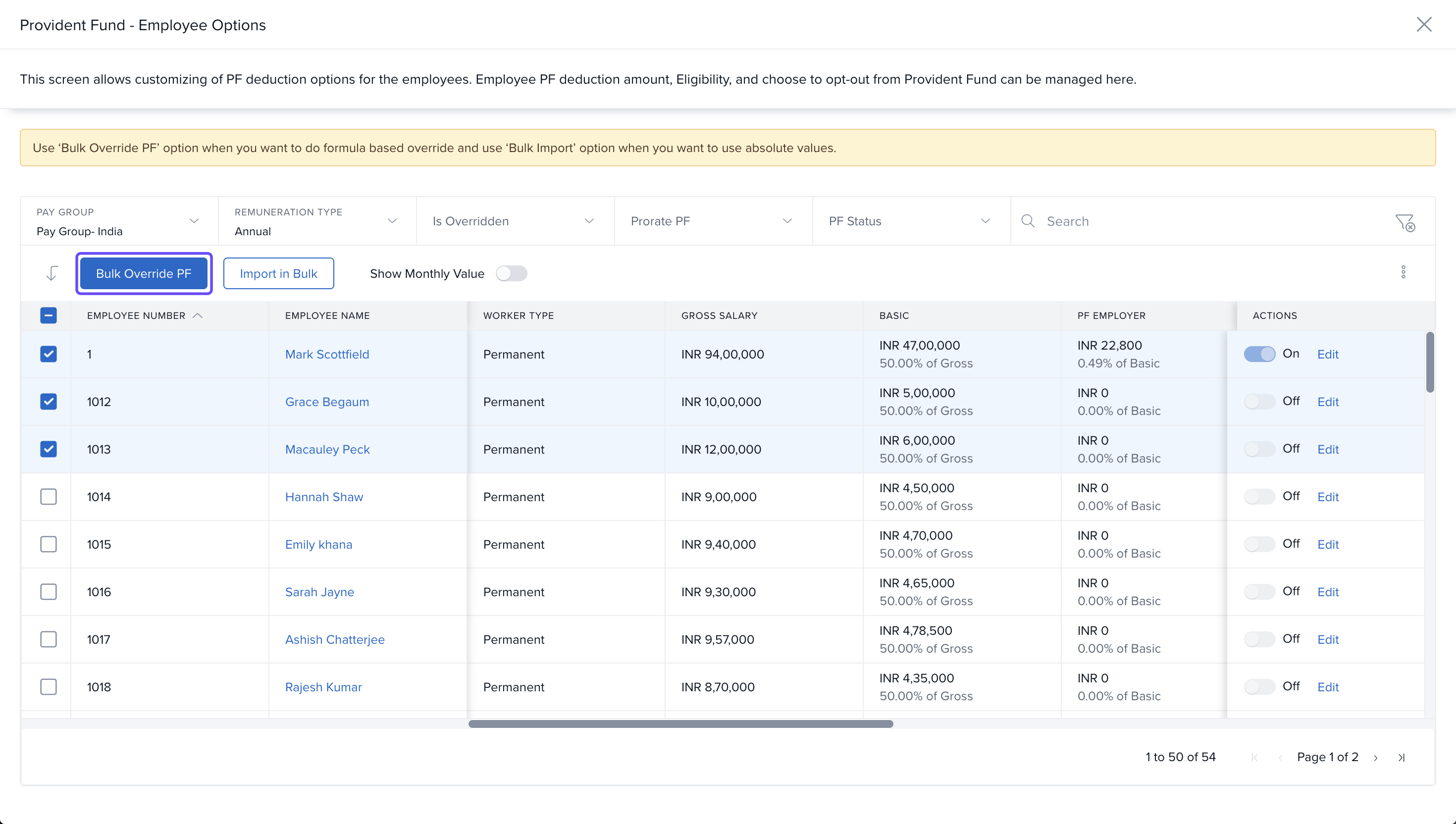 Choose the Pay Group and select the employees, then click Bulk Override PF.