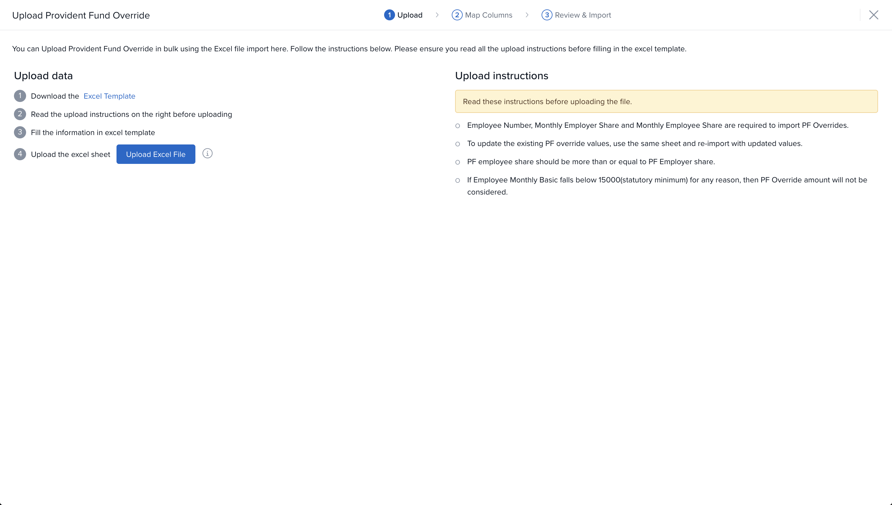 In the Excel file, set PF Override = Yes and enter the updated employee and employer contribution values.