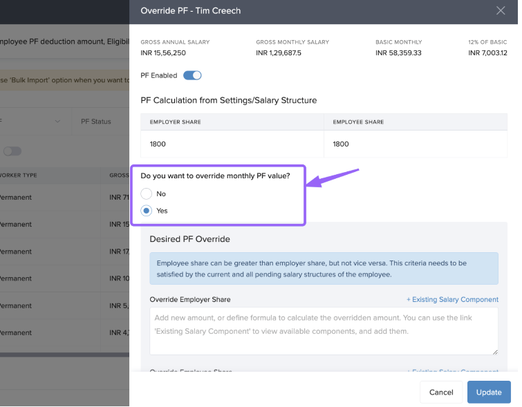 Toggle “Do you want to override monthly PF value?” to Yes.