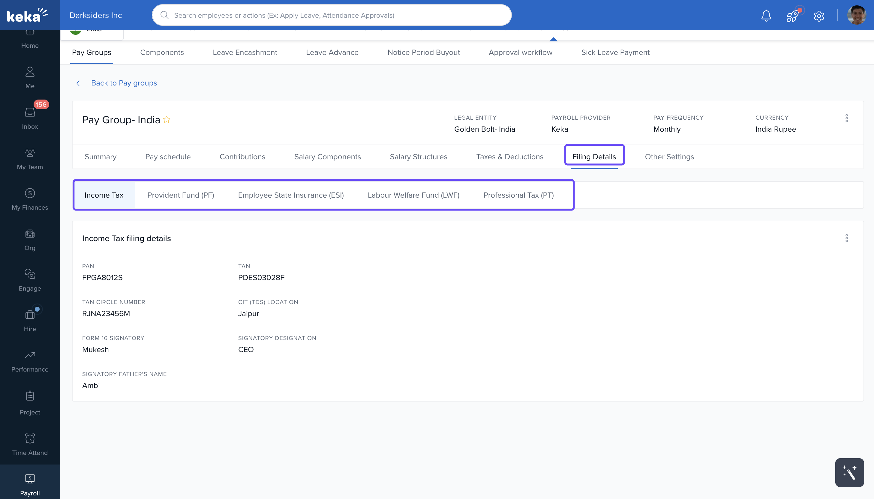 You will see tabs for various statutory filings: Income Tax, PF, ESI, LWF, and PT.