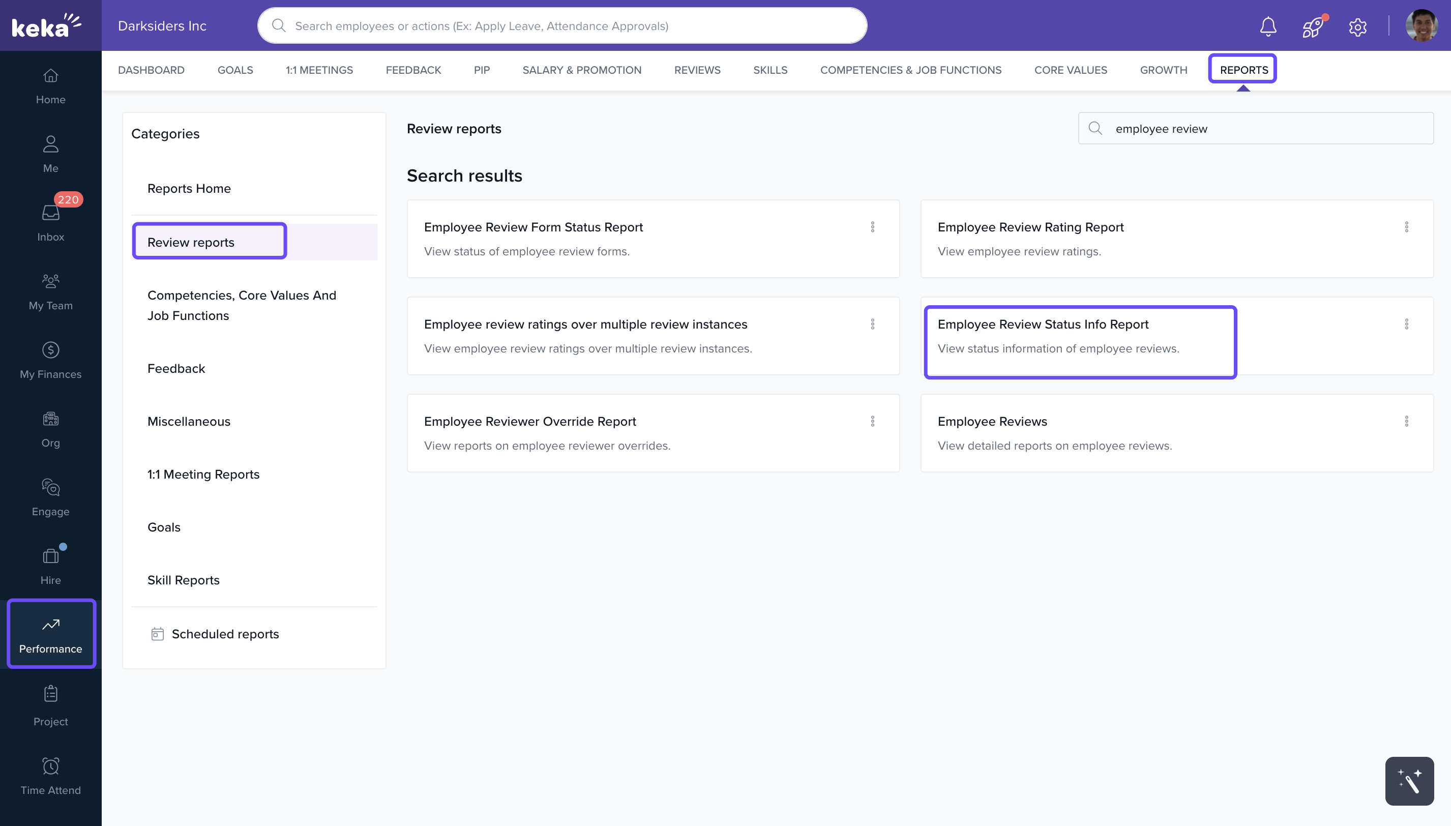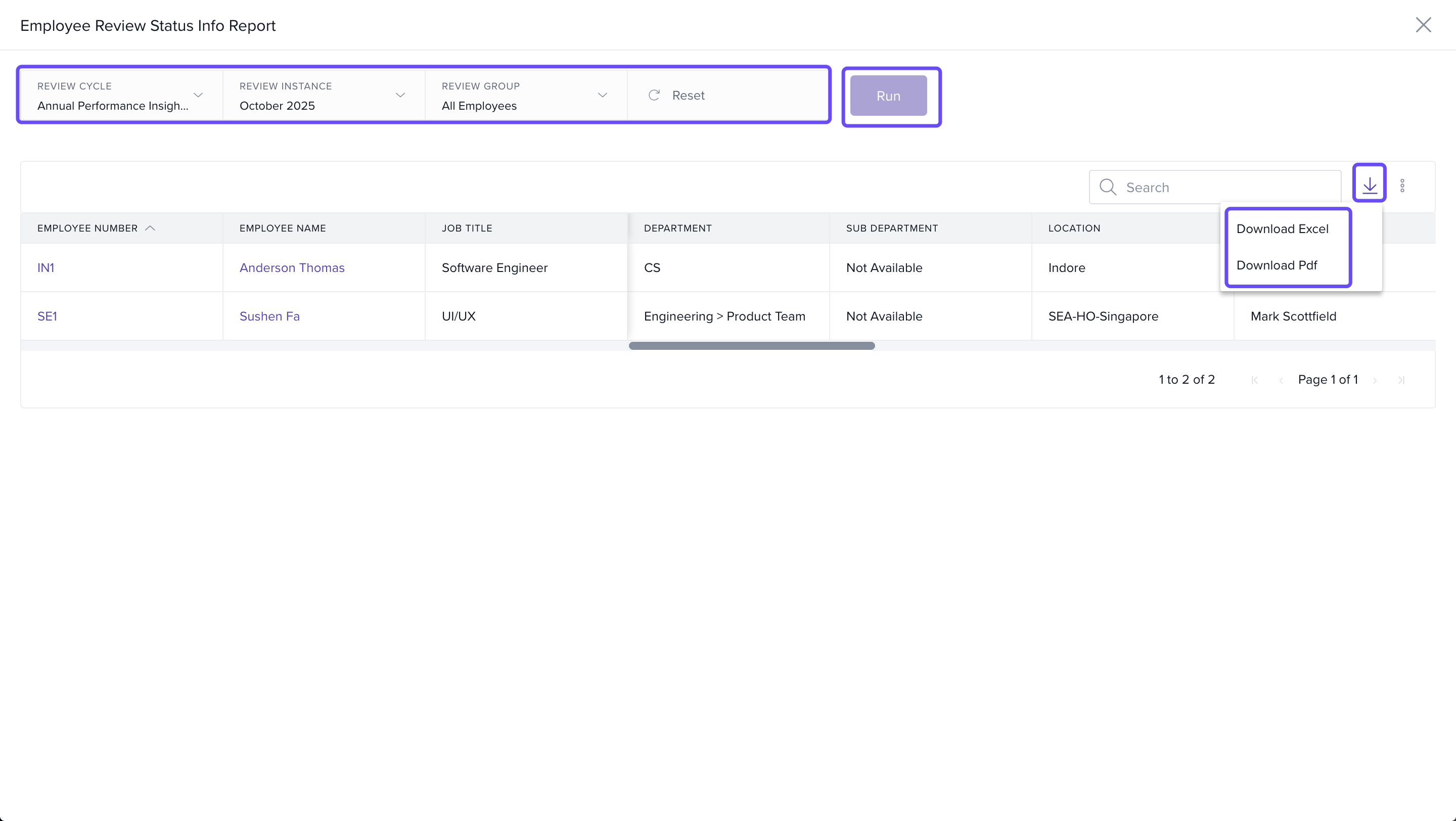 While a review is in progress, you might want to track the status of each employee’s review. Keka allows you to easily download the Review Status Info Report, which provides an overview of each employee's review status within a cycle.