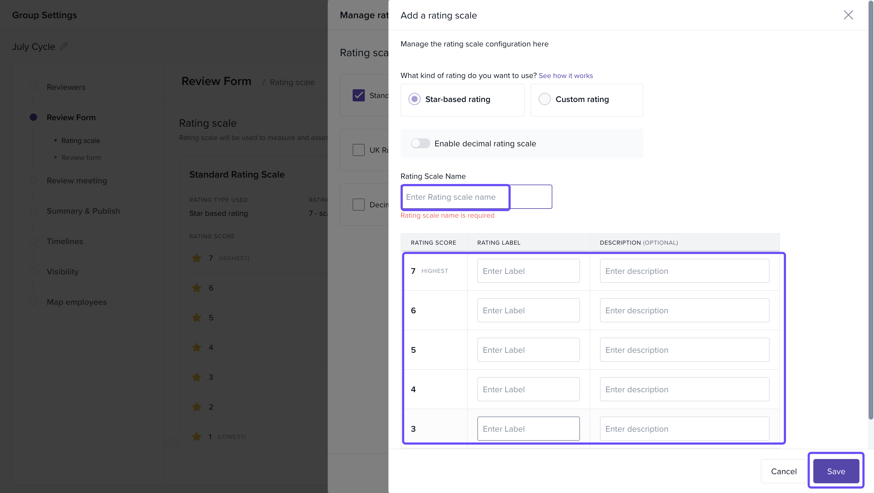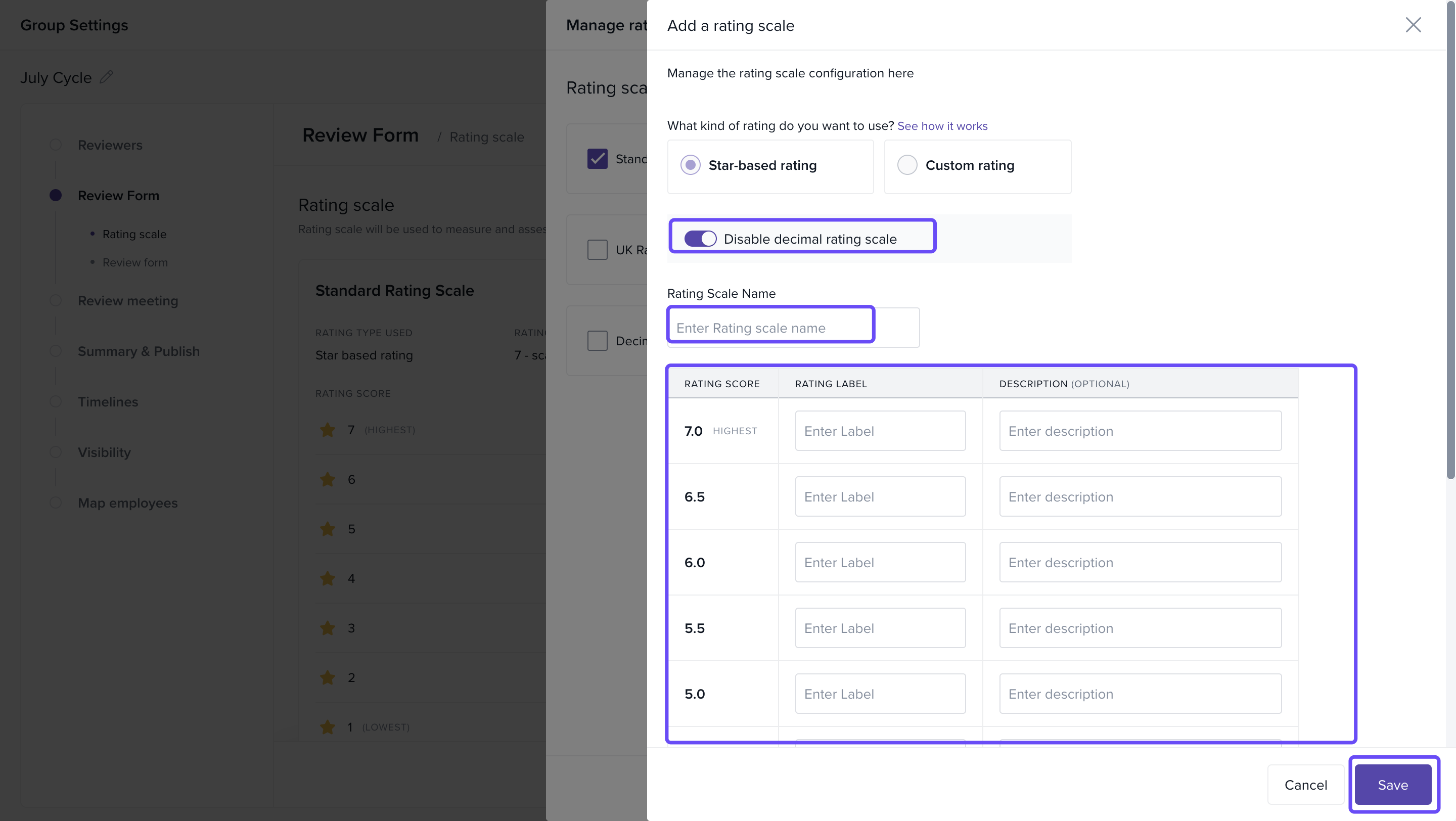 Once enabled, you can add the rating scale name and define each rating label along with its description.