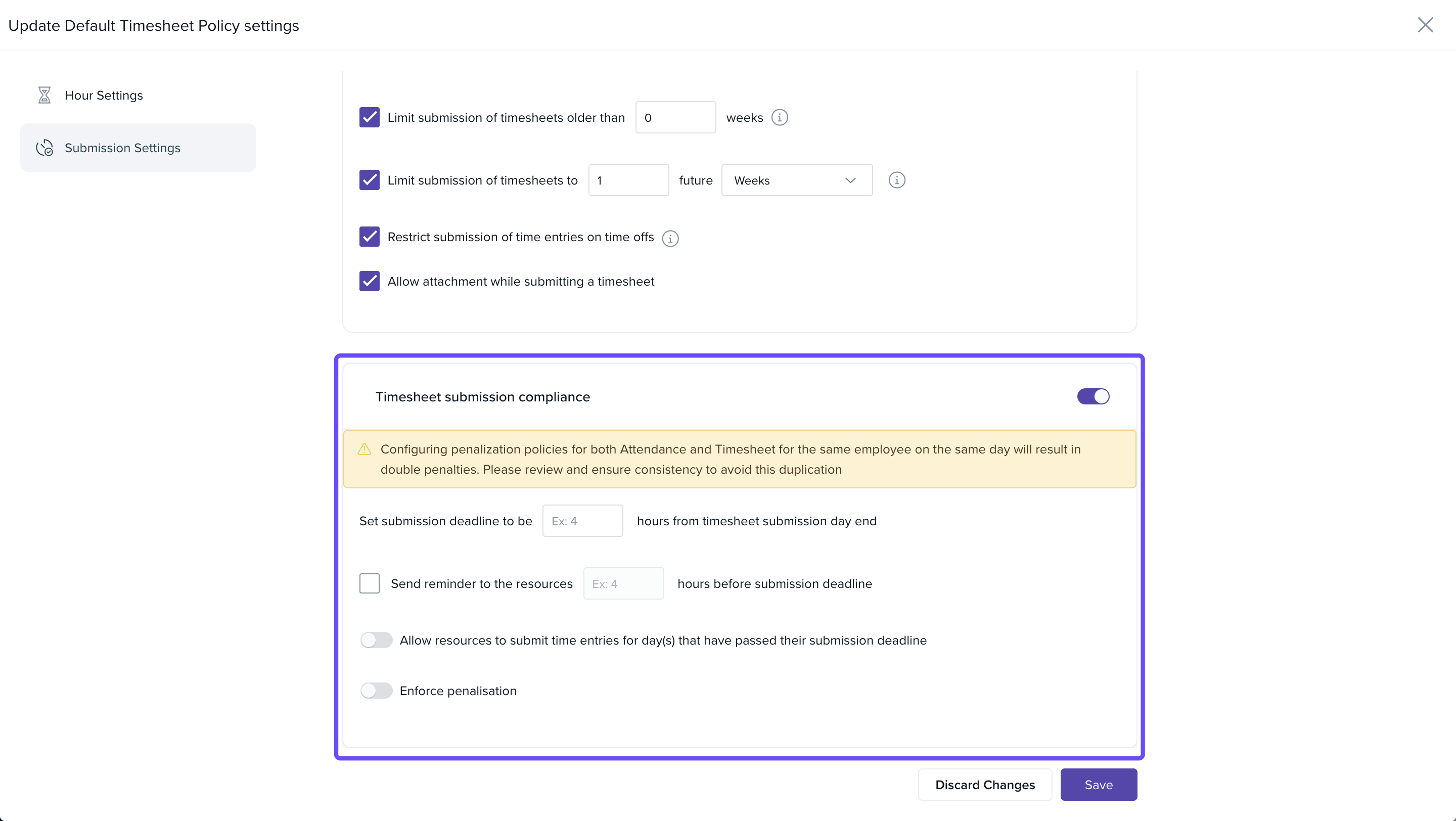 This section allows you to set up daily and weekly restrictions for time entry and define automated penalties for non-compliance.