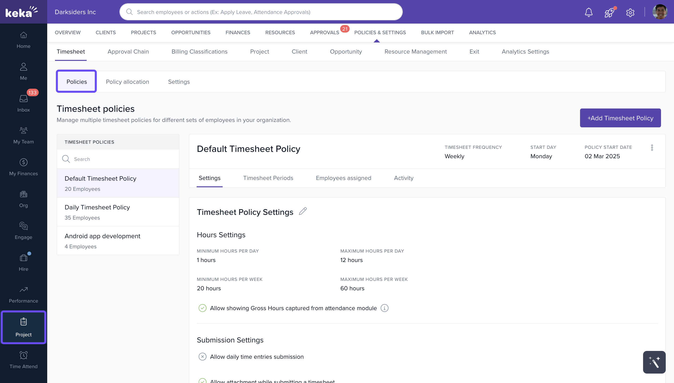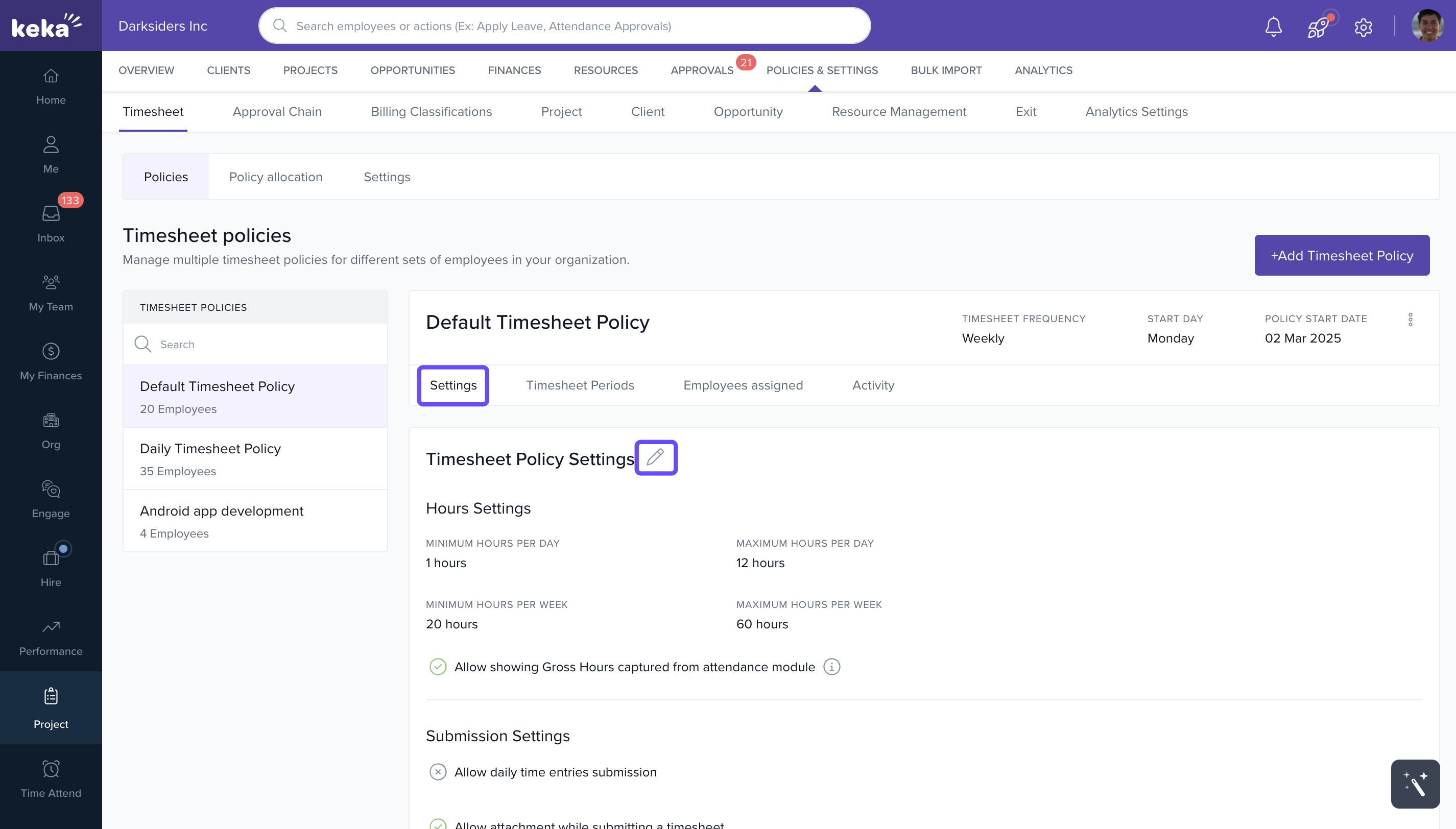How to manage and configure timesheet policy settings in Keka PSA.