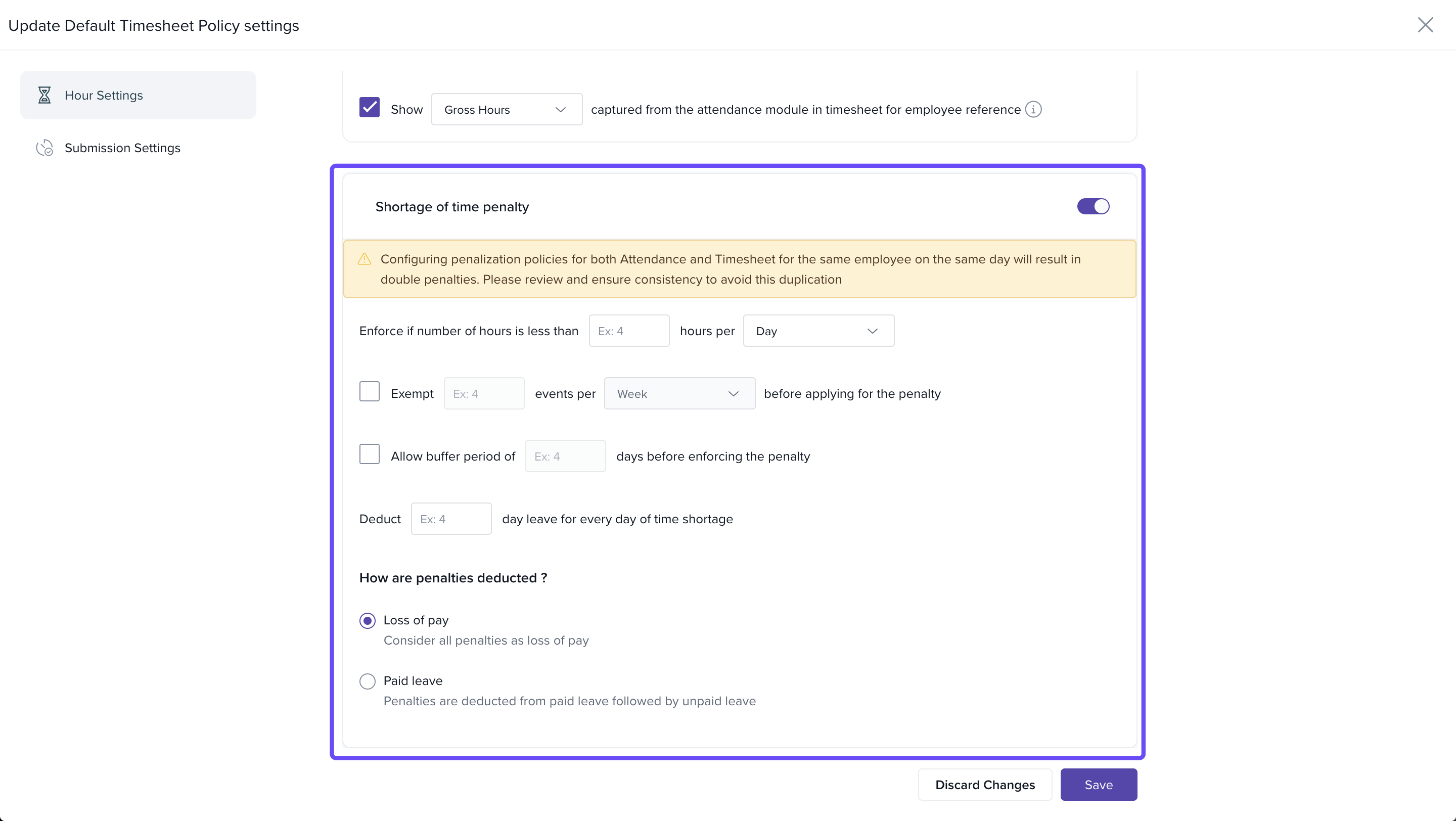 Shortage Penalty: Apply penalties when employees log fewer hours than required. Define thresholds for hours per day or week.