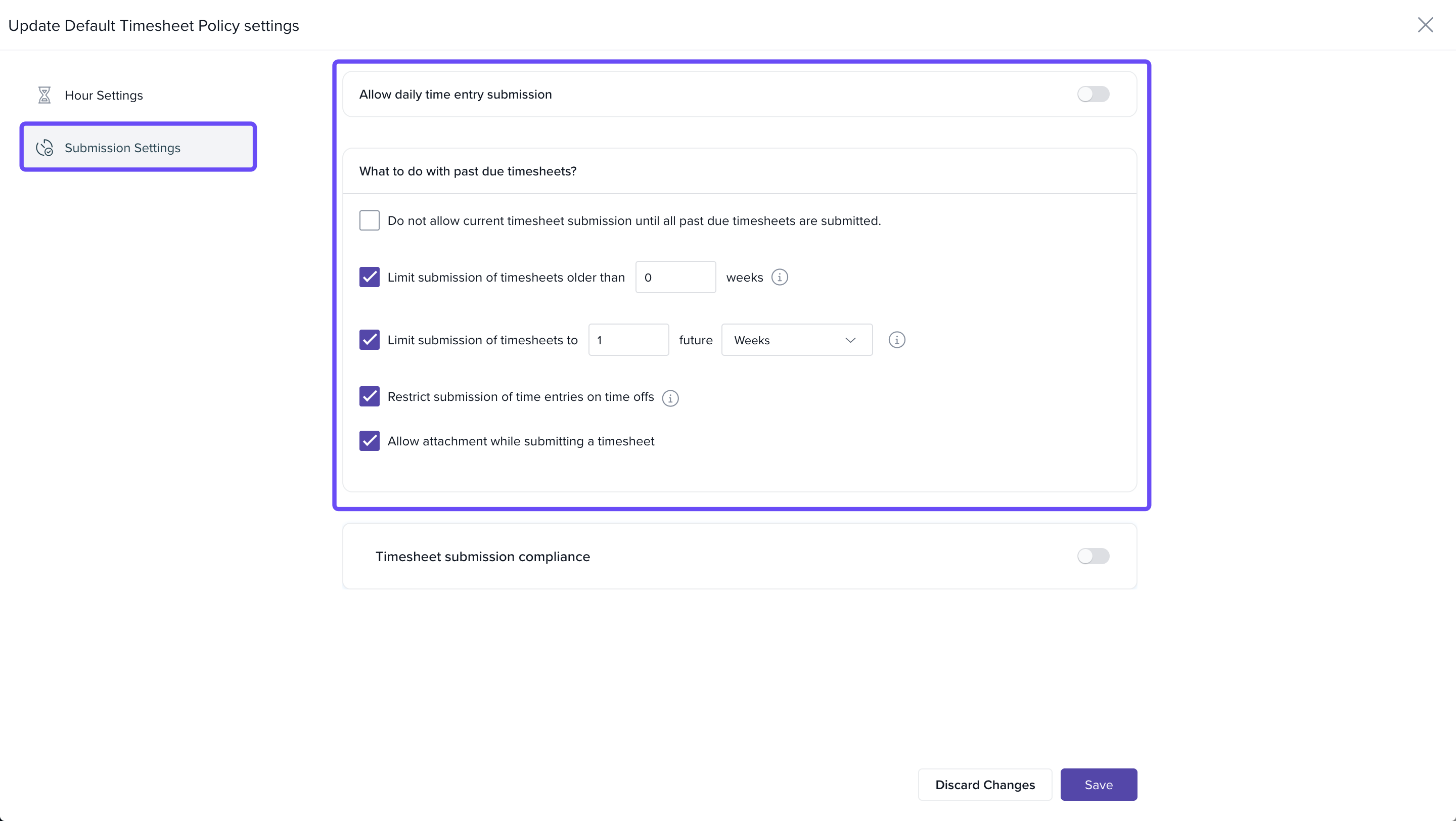 Handling Past-Due Timesheets: Configure how missed or future entries are handled:
