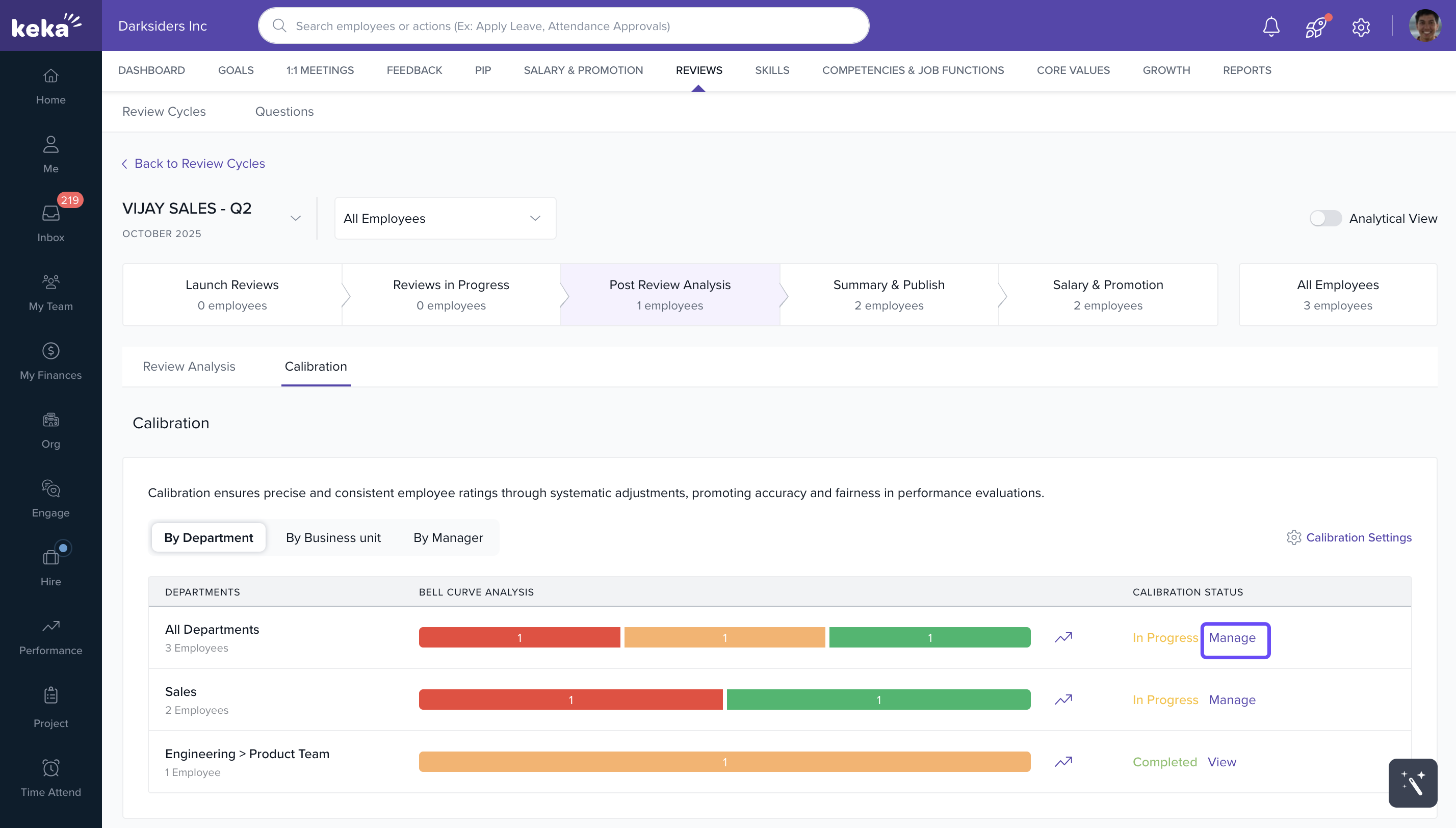 Under the Calibration tab, you can filter employees by department, business unit, or manager to identify the individuals for whom you want to initiate the calibration process.