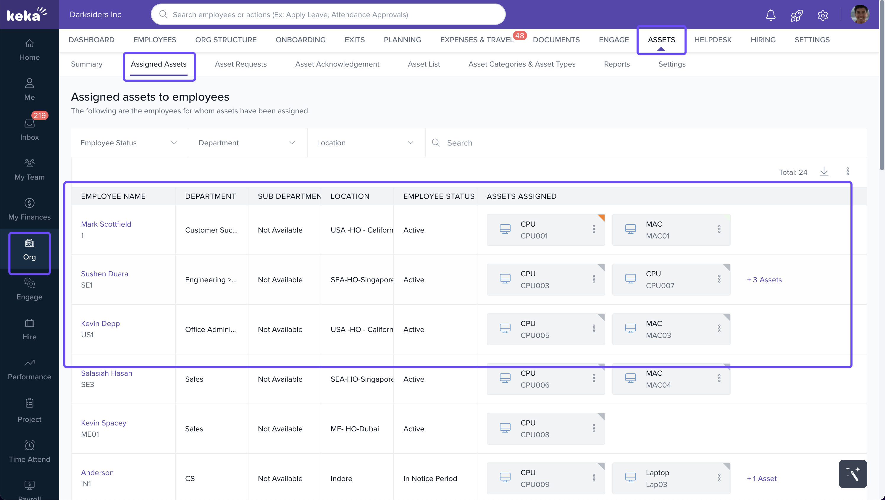 You can easily view the list of employees who have assets assigned to them on Keka. Follow these steps: