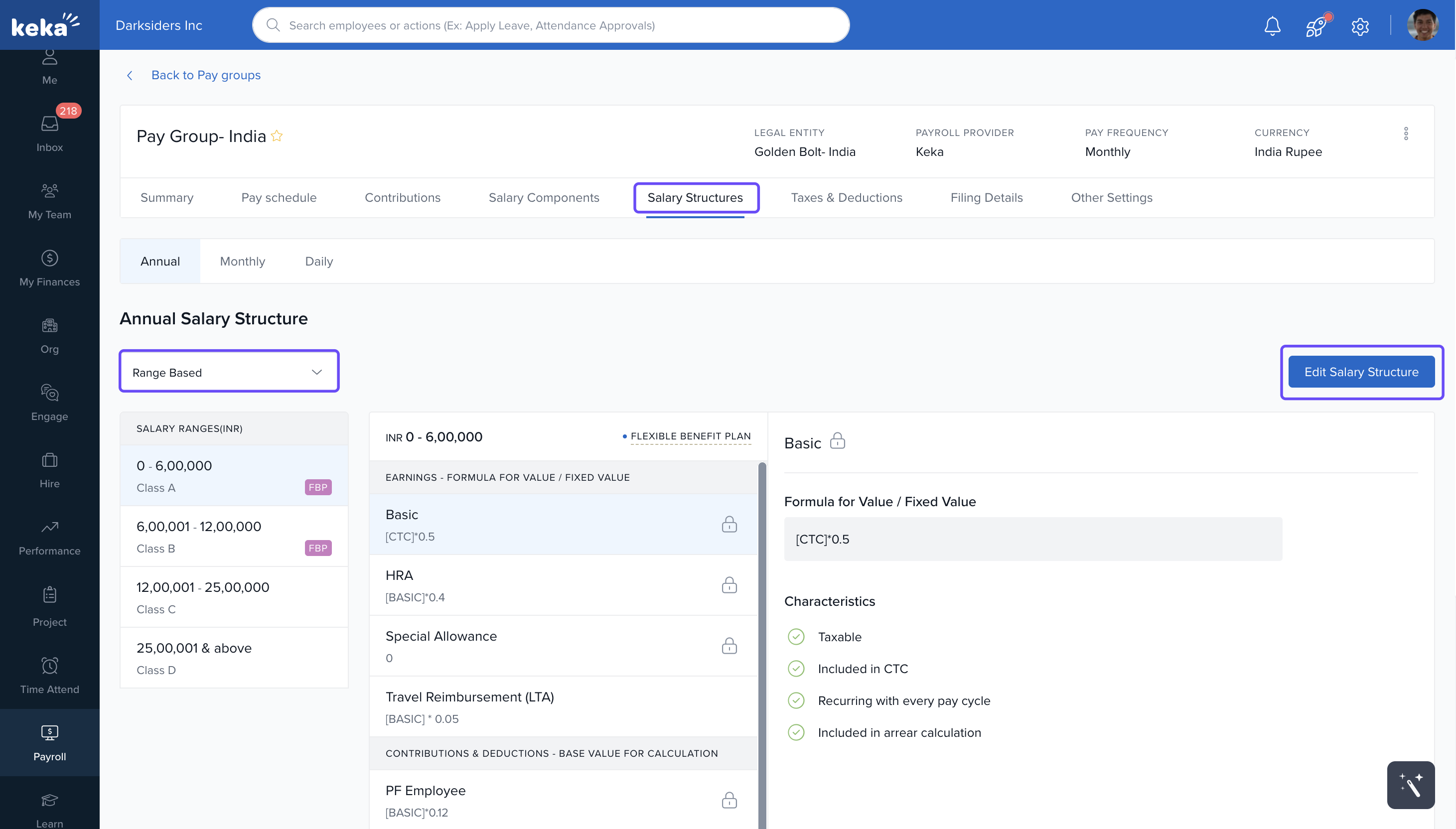 In the Salary Structure tab, click on Range Based Salary and then click Edit Salary Structure.