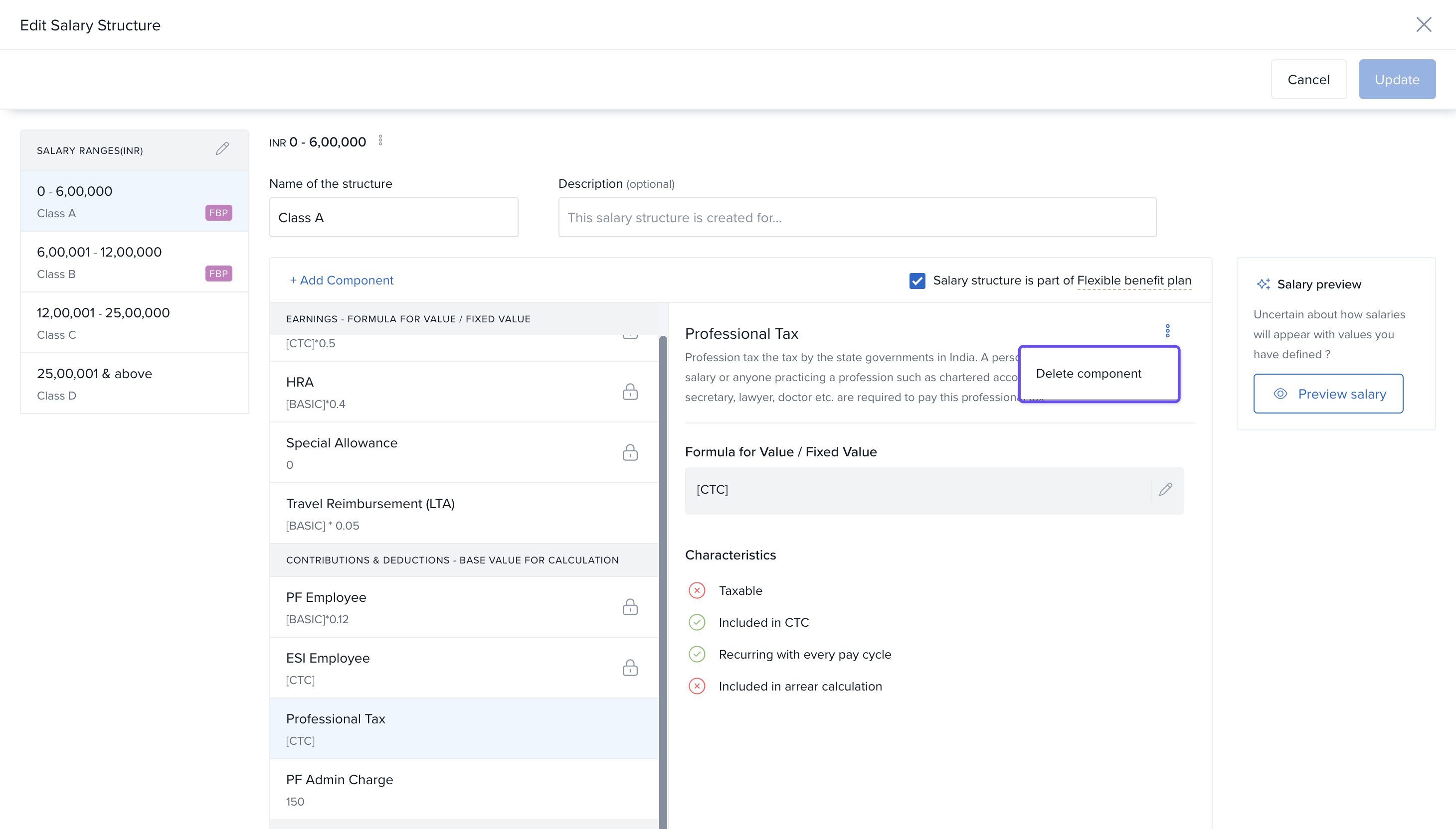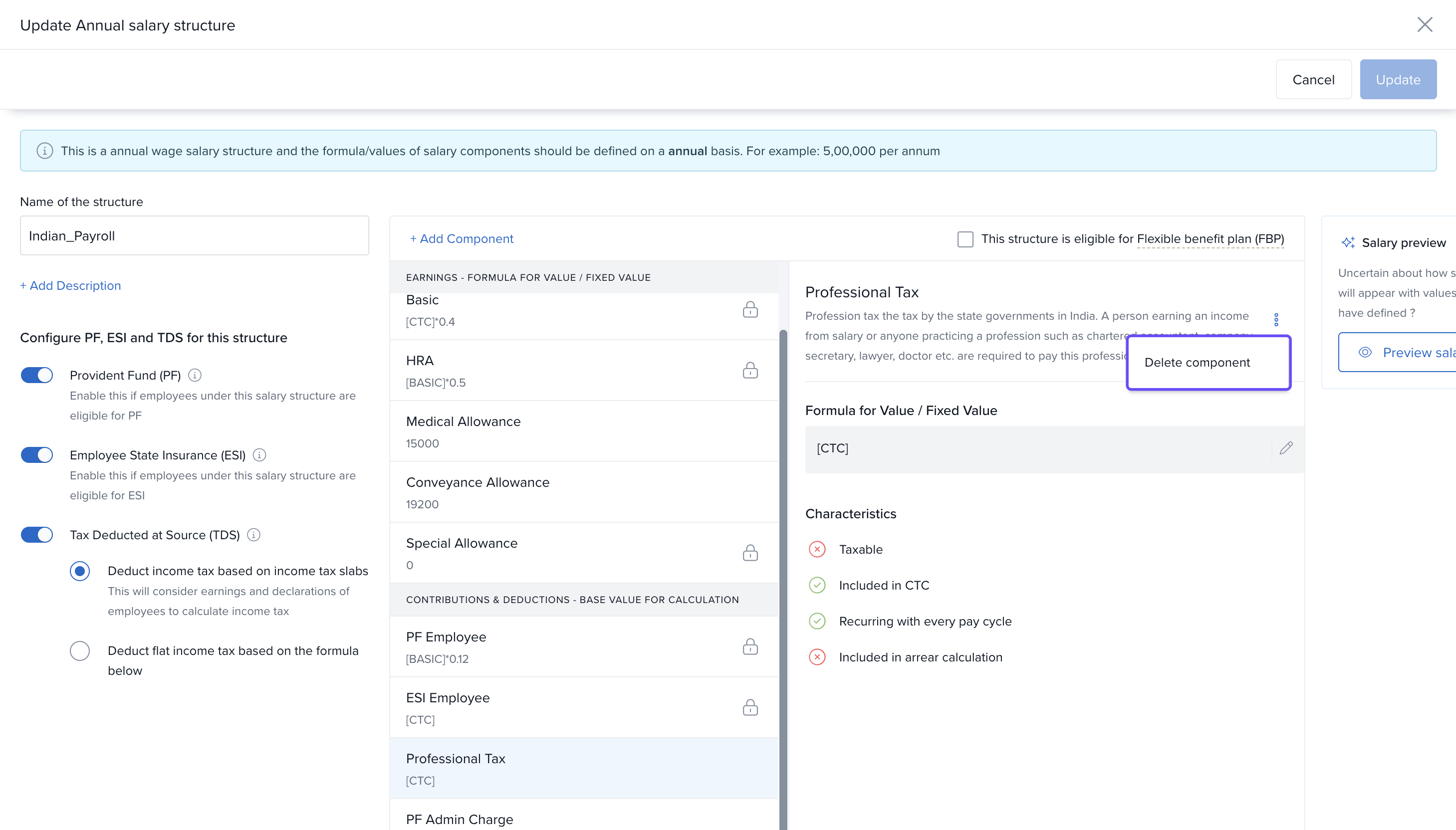In the next window, click on Professional Tax → click the three dots → select Delete Component.