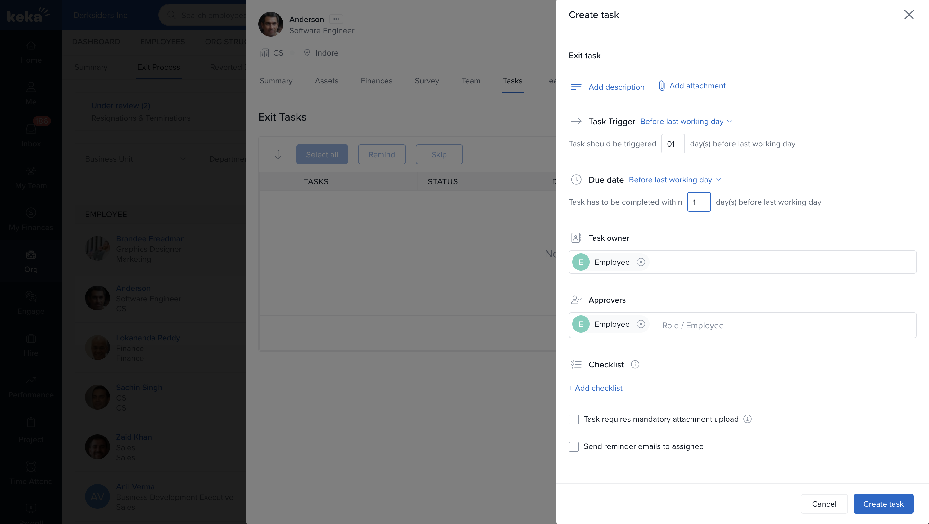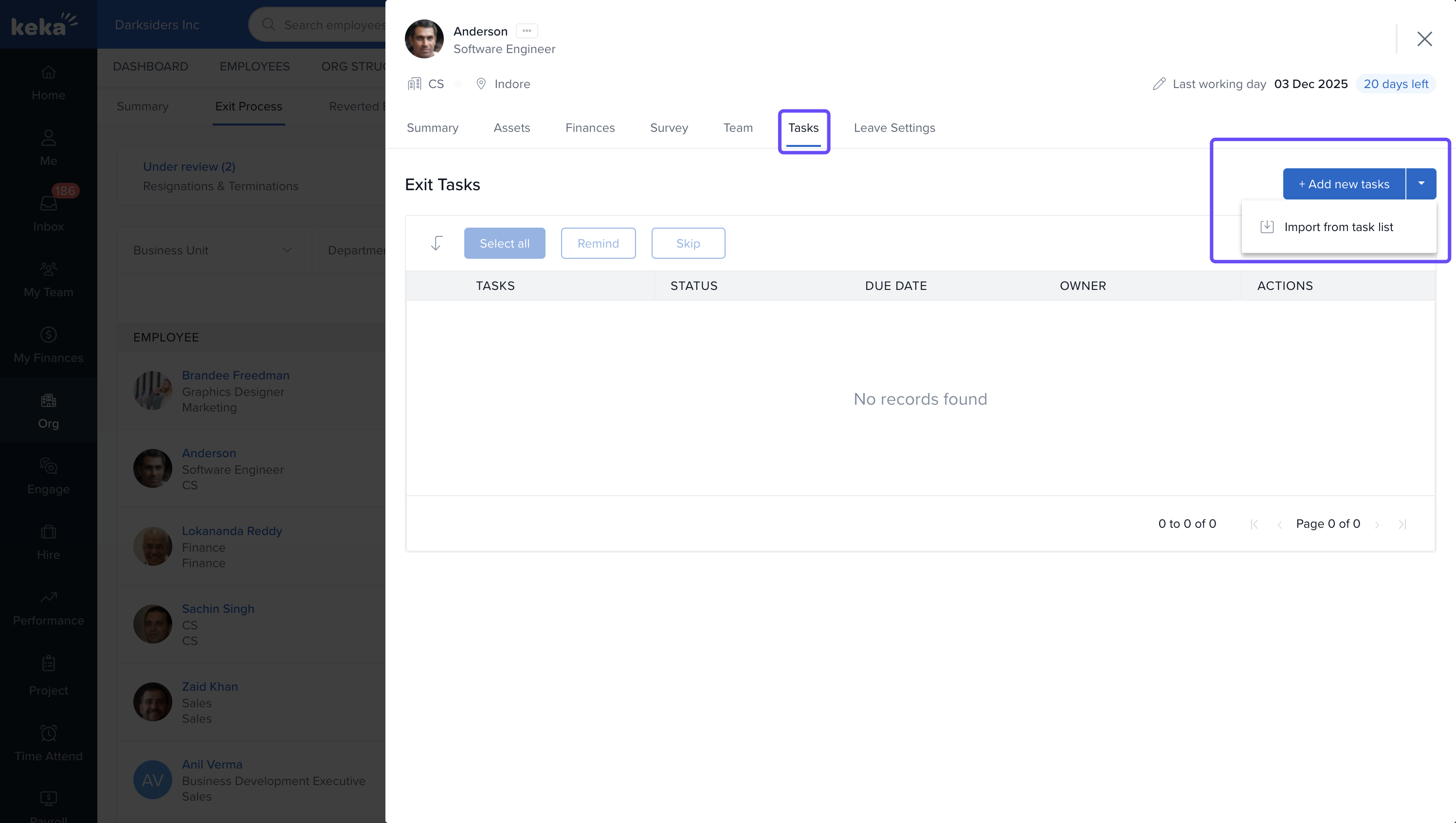 An Exit Task List is essential for ensuring a smooth transition when an employee leaves the organization. It includes tasks like returning company property, transferring files, settling expenses, and completing paperwork. Keka allows you to assign these tasks easily, whether through templates or individual tasks.