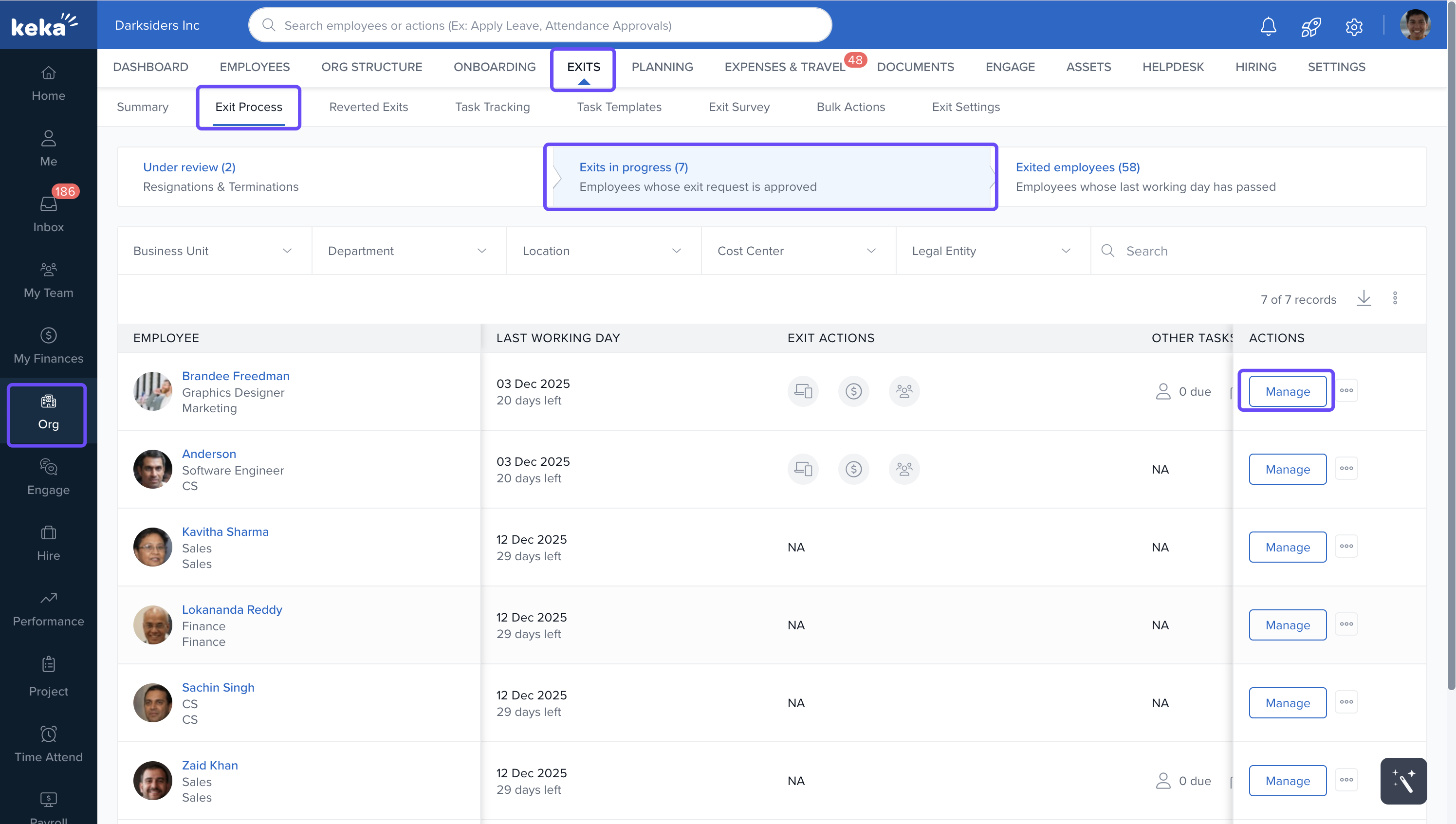 Go to Org > Exits > Exits in Process: Navigate to the Exits in Process tab to see employees in the exit process.