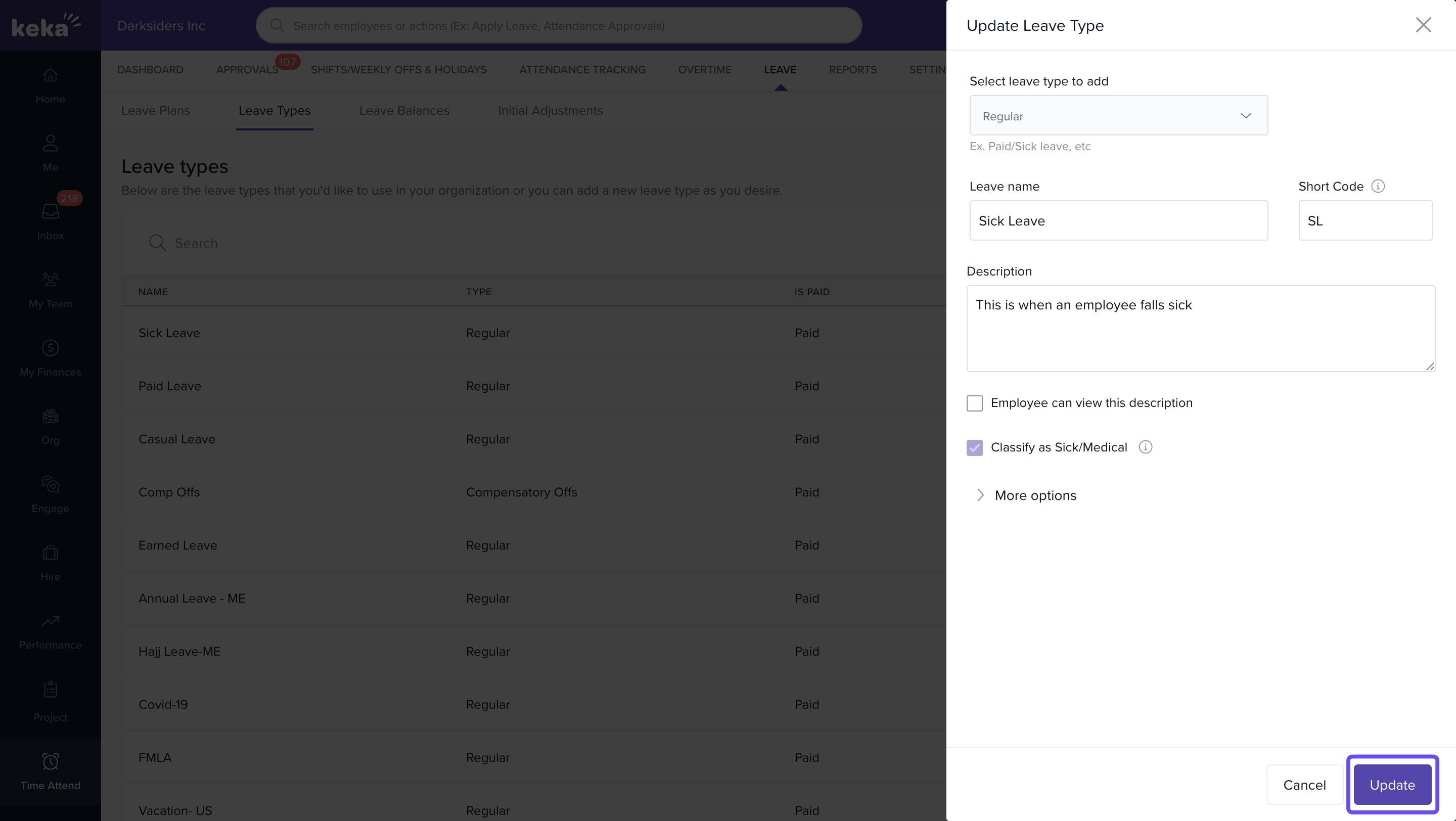 Go to Time Attend > Leave.Open the Leave Types tab.Find the leave type you want to edit and click on the Edit Icon.In the window, change the Name, Short Code, and Description as needed.Click Update to save the changes. Related articles How to cancel credited comp-off for an employee? Do's and Don'ts during Year End Processing Overview of Leave plan and leave types New Scorecard response types Configuring Sick Leave Payment for GCC Countries in Keka Comments 0 comments Please sign in to leave a comment.