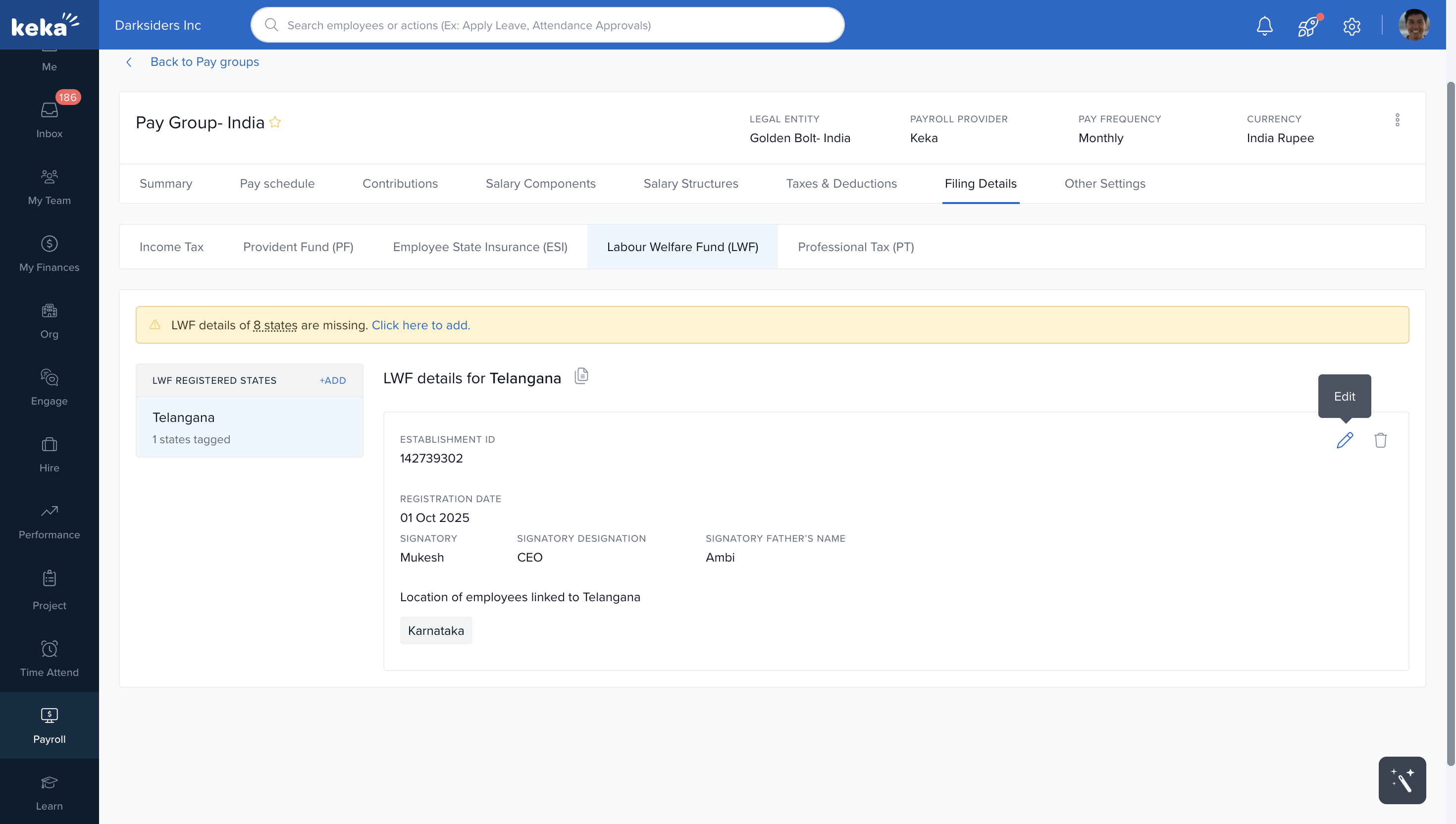 In the Pay Group details page, go to Filing Details → Labour Welfare Fund (LWF).