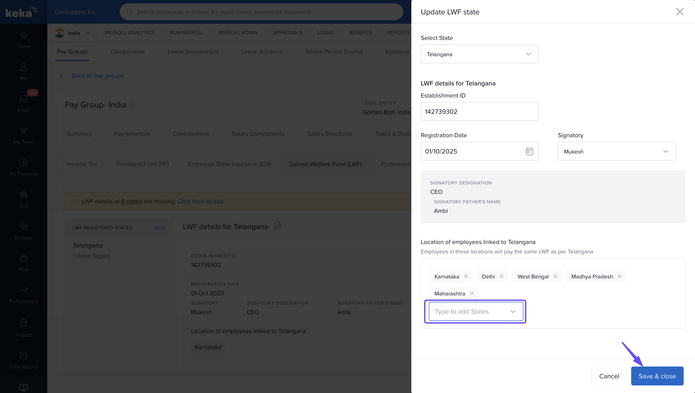 In Keka, LWF contributions are calculated based on the registered state of the organization.