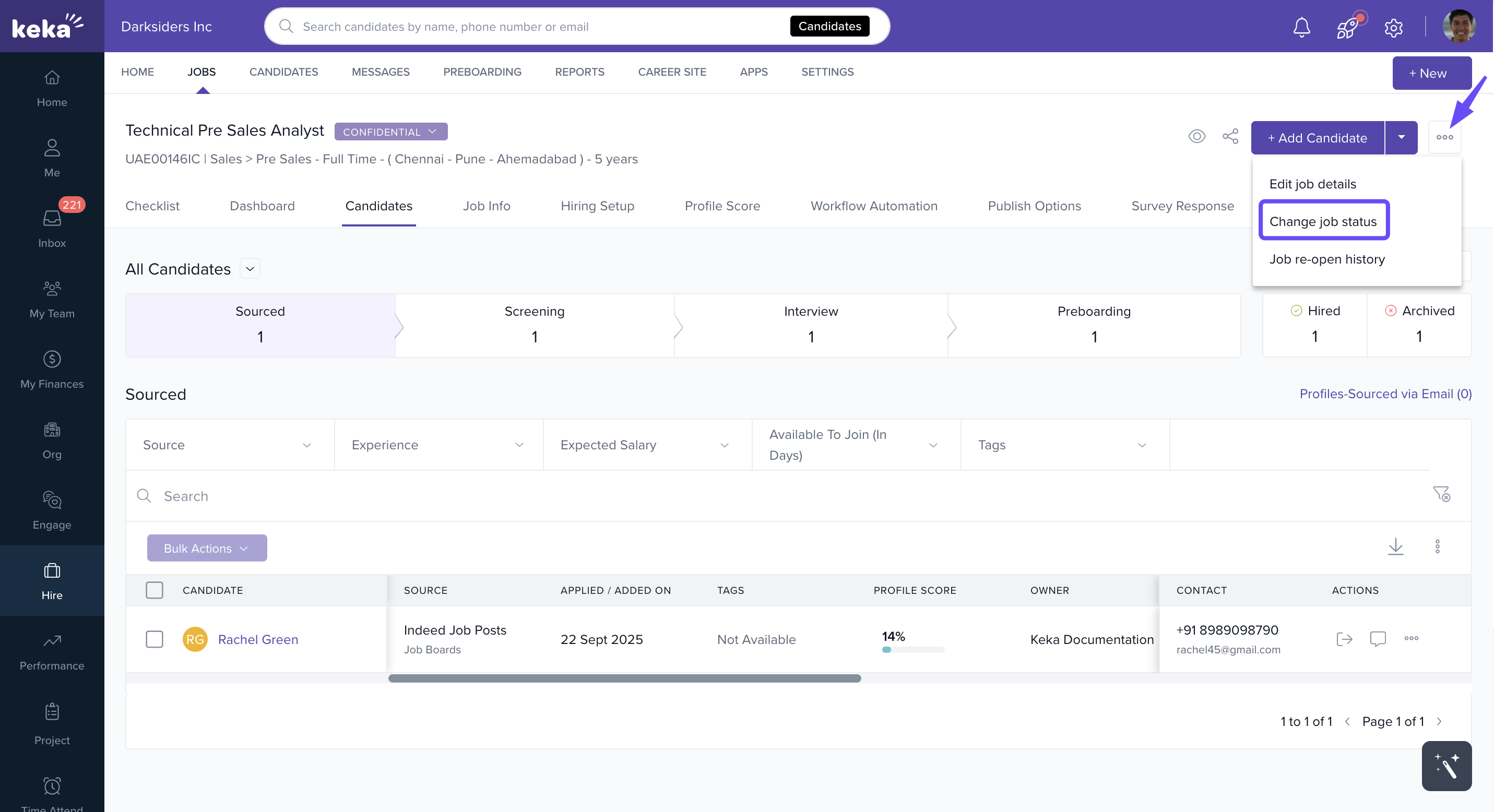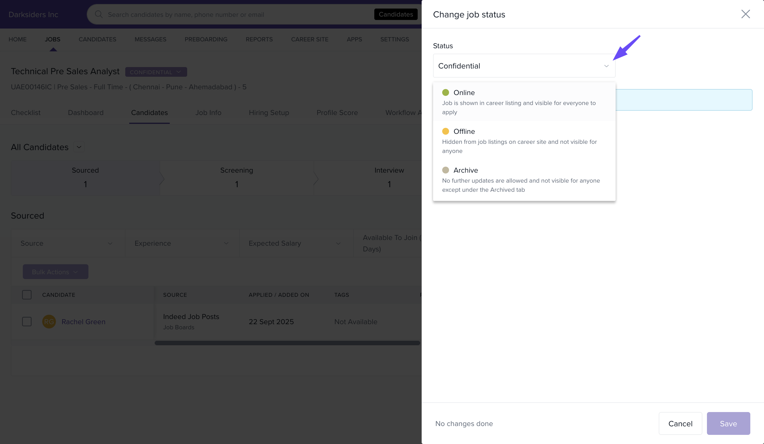 In Keka Hire, a job opening can have three statuses if not the default online status. They are - Offline, Confidential, and Archived. Keka allows you to modify the status of a job at any given point in time.
