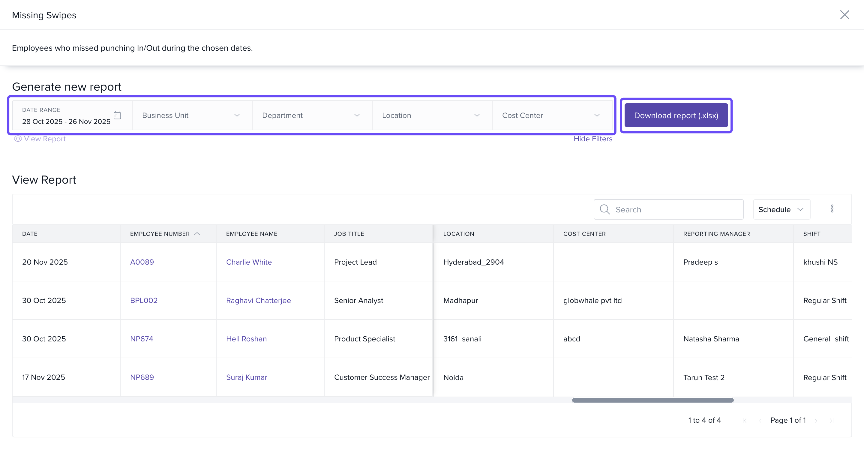 - The Missing Swipe report will display, showing the Total Missing Swipes for each employee.