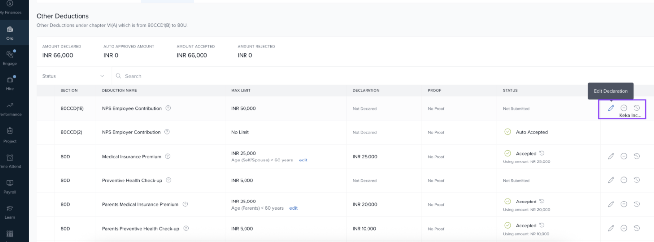 Admins in Keka can manage employee tax declarations and upload investment proofs on their behalf—especially helpful when employees are unable to do so. This ensures timely compliance and accurate tax calculations.