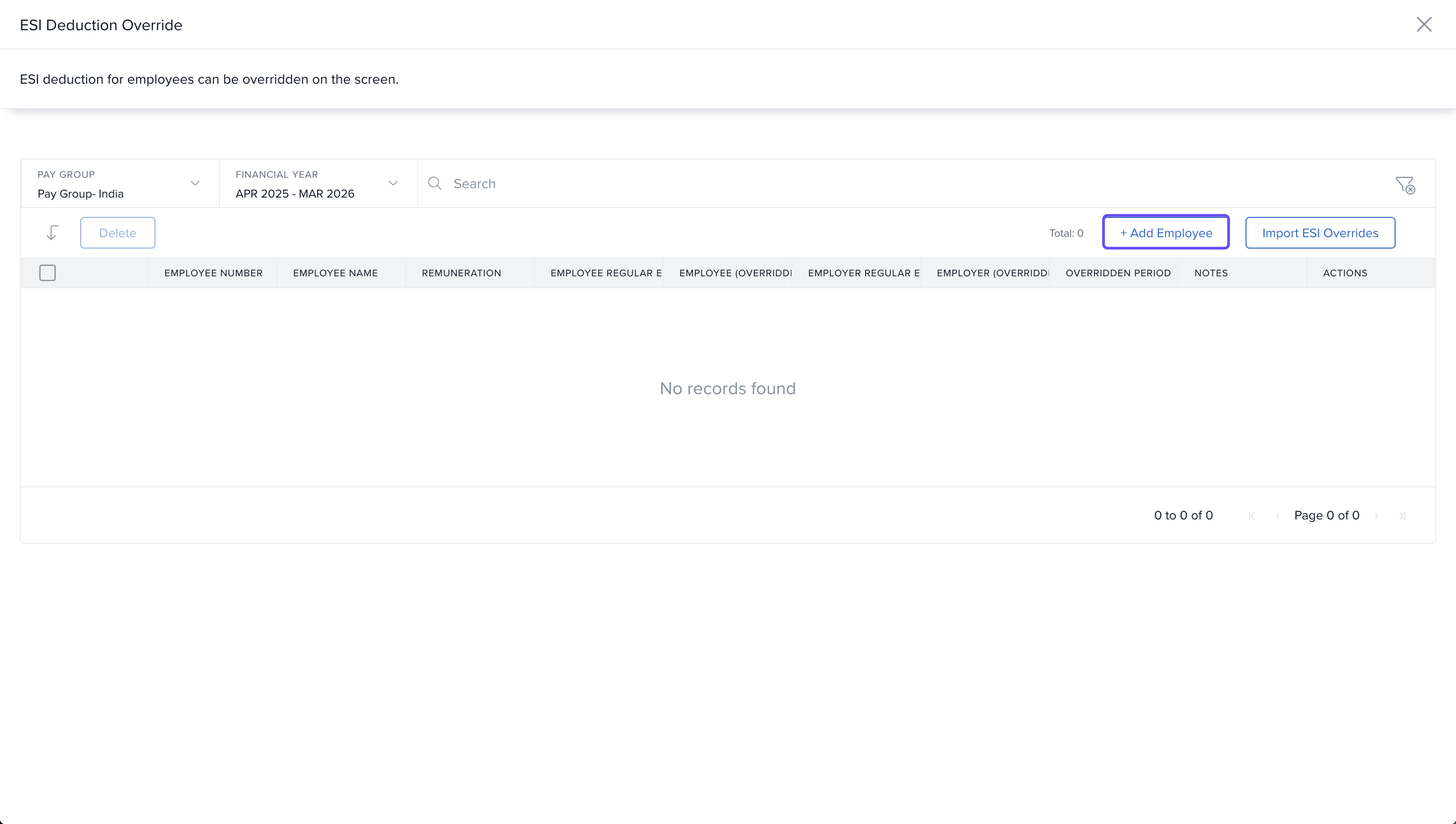 On the ESI Deduction Override window, select the Pay Group and Financial Year.