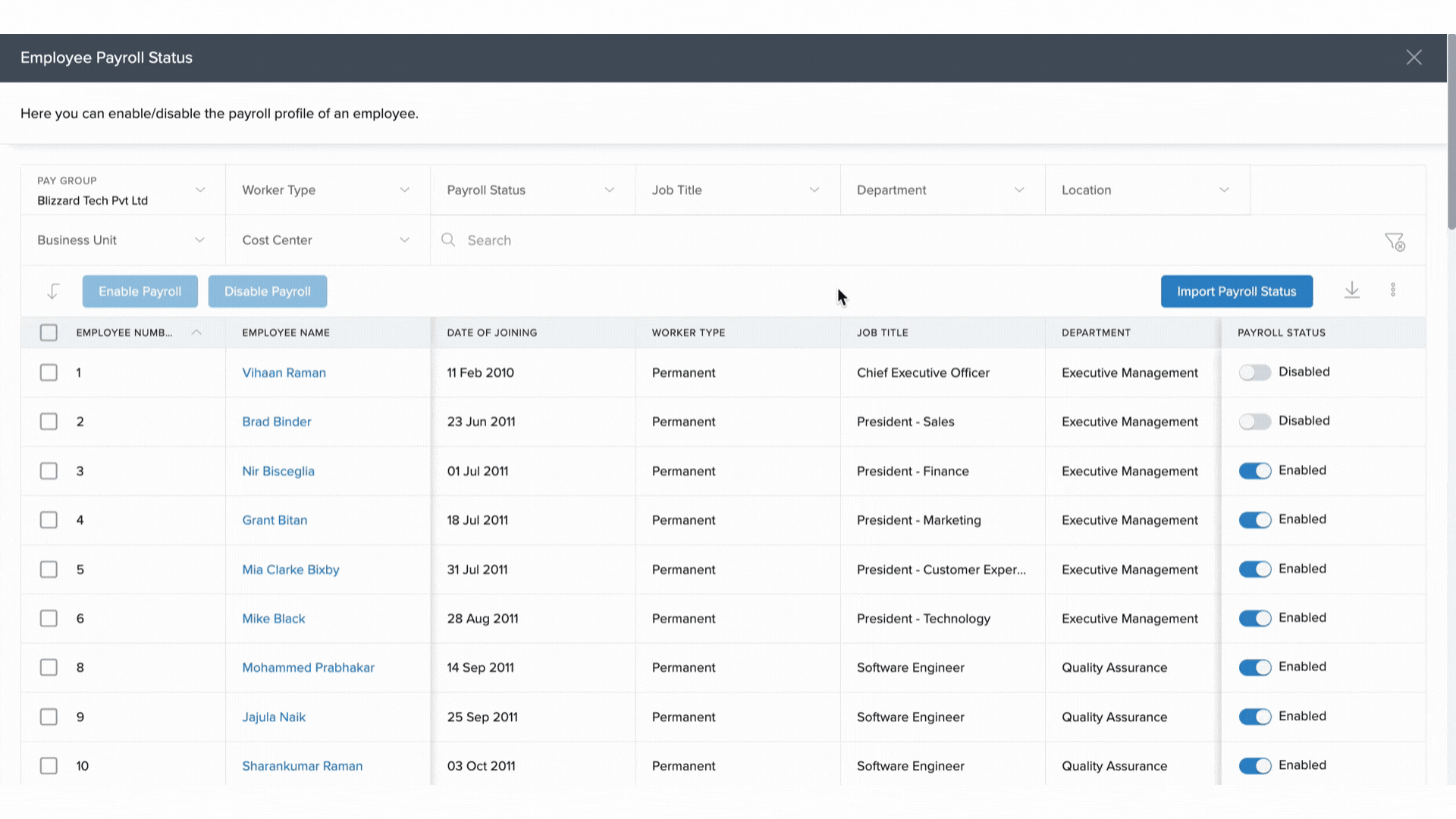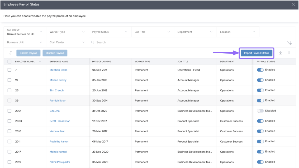 5. Click Enable Payroll or Disable Payroll to apply the change in bulk.