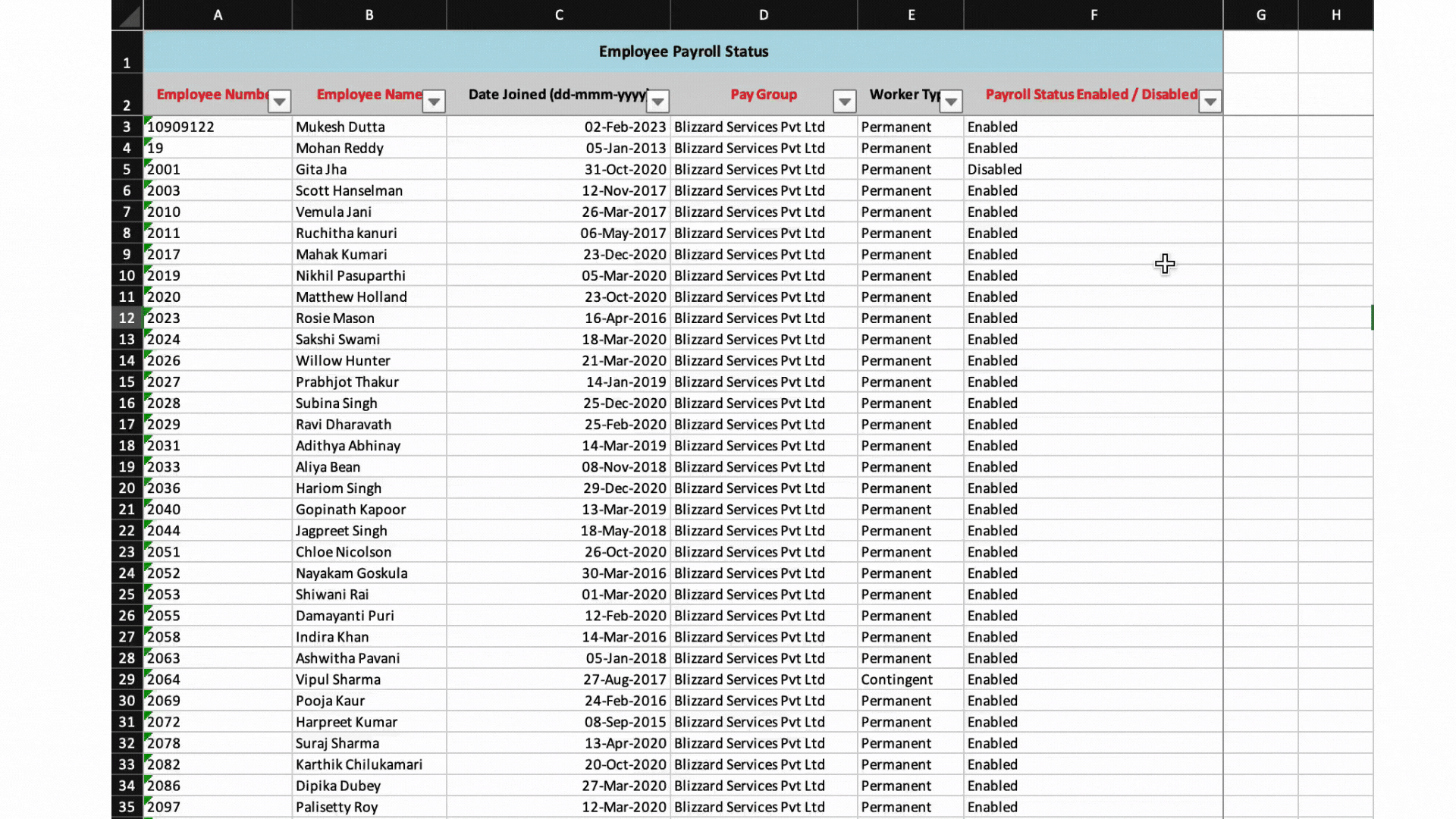 6. In the Excel file, update the Payroll Status Enabled/Disabled column.