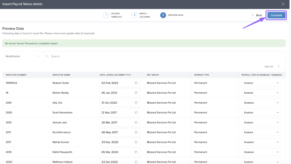 10. Fix any errors if shown, then click Complete to finish the import.