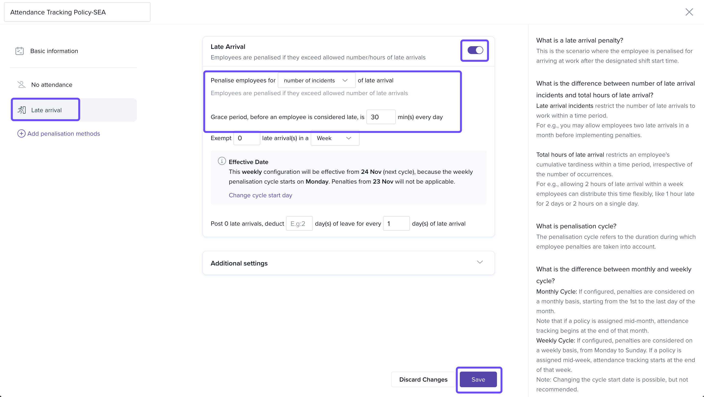 - Choose whether to penalise based on number of incidents or total late hours.