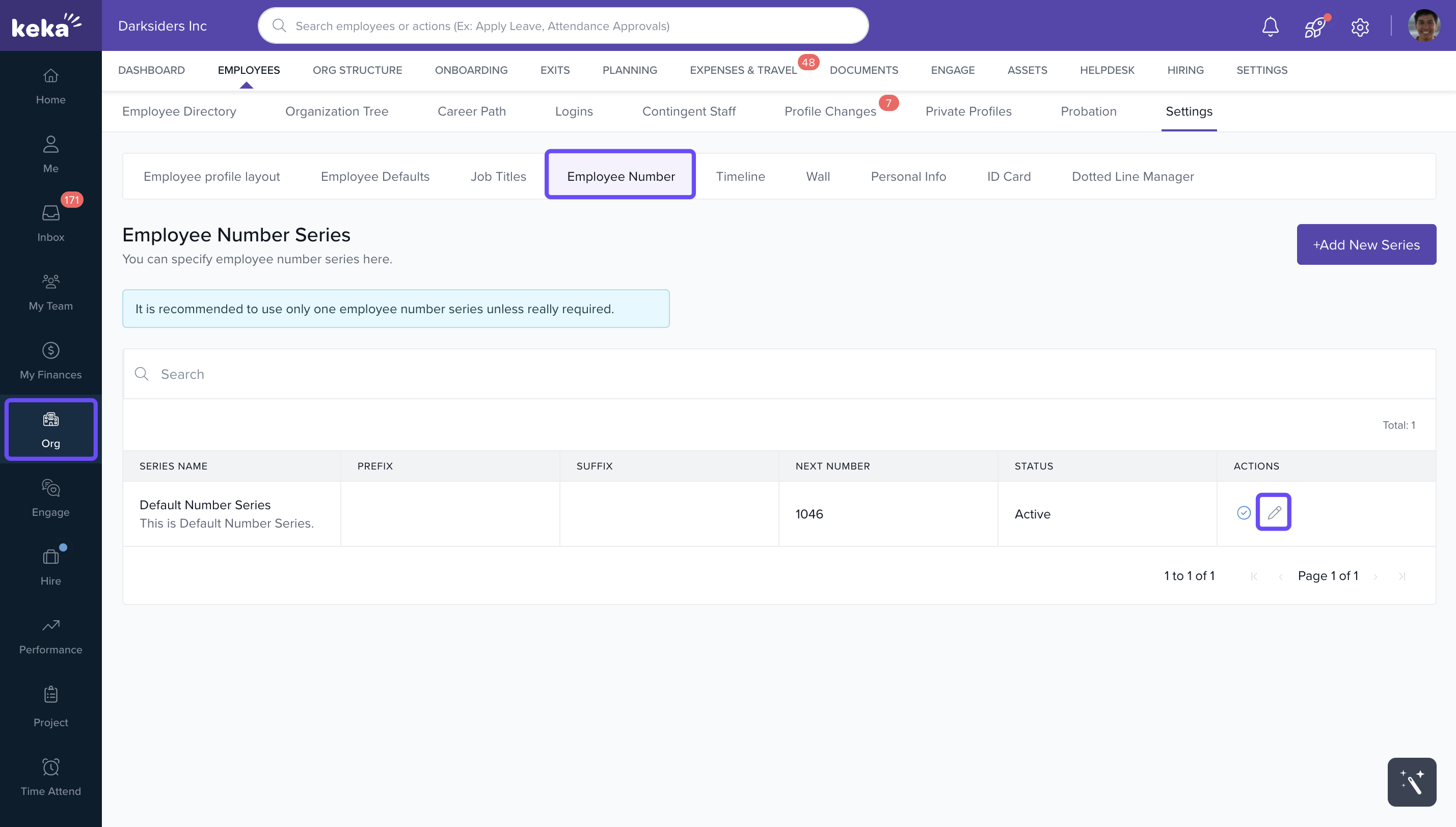 - You’ll see the Default Number Series configured. To customize, click the Edit icon under Actions.