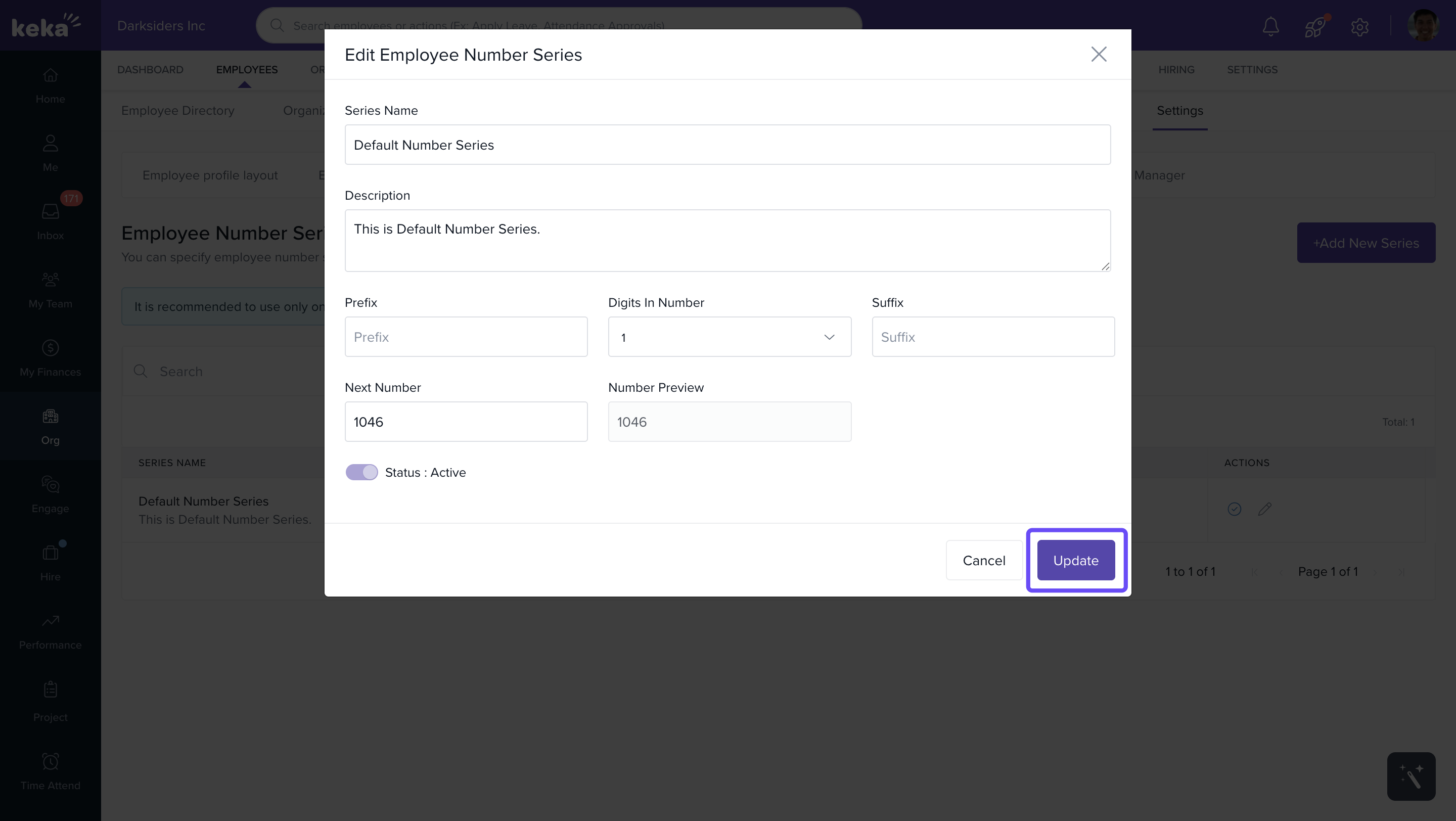 - In the Edit Employee Number Series window, modify the Name, Description, Prefix, Digits in Number, and Suffix as needed.